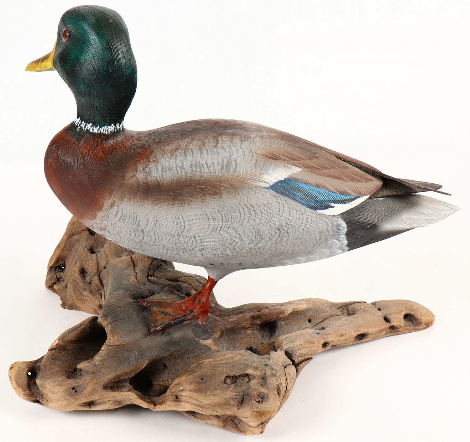 Mallard Drake by William Veasey, GE solid wood, mint original paint, on stand, 11'' OAL. Grade: MINT - Value: 30 to 90