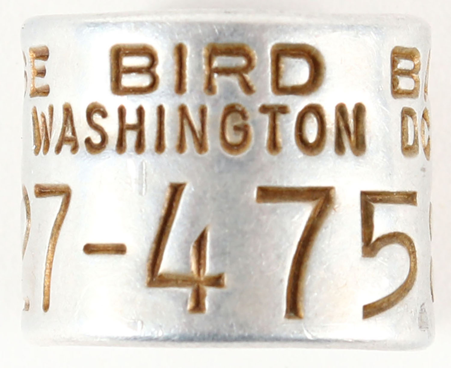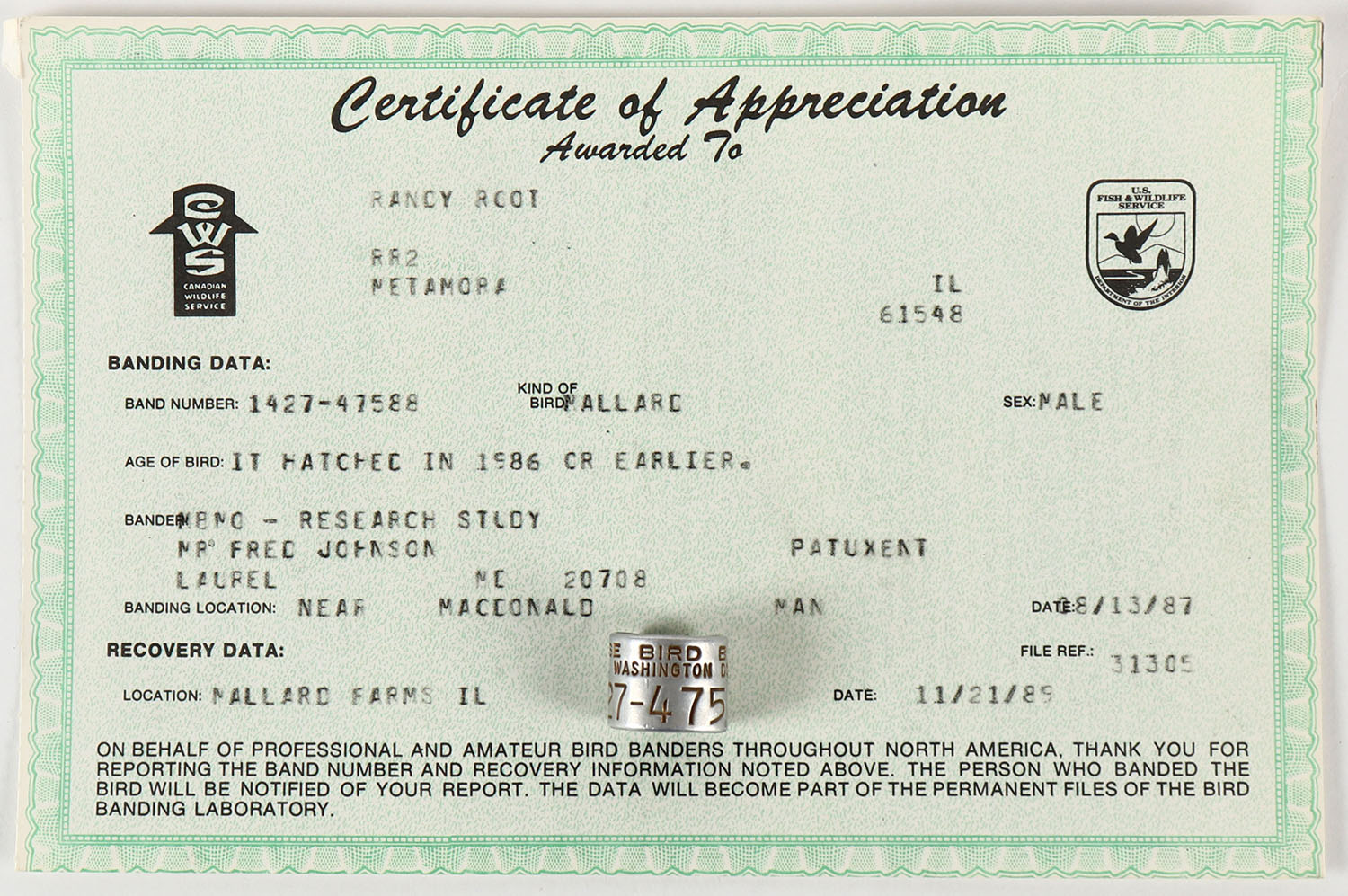 DUCK BAND, with certificate from 1987 we are offering a few duck bands that were all shot at one duck club in Peoria IL from 1964 - 1999, ''MALLARD FARMS R R 2'', this one has a certificate, this one was banded NEAR Macdonald MAN 08/13/87 and shot 11/21/89. Grade: Excellent - Value: 30 to 60