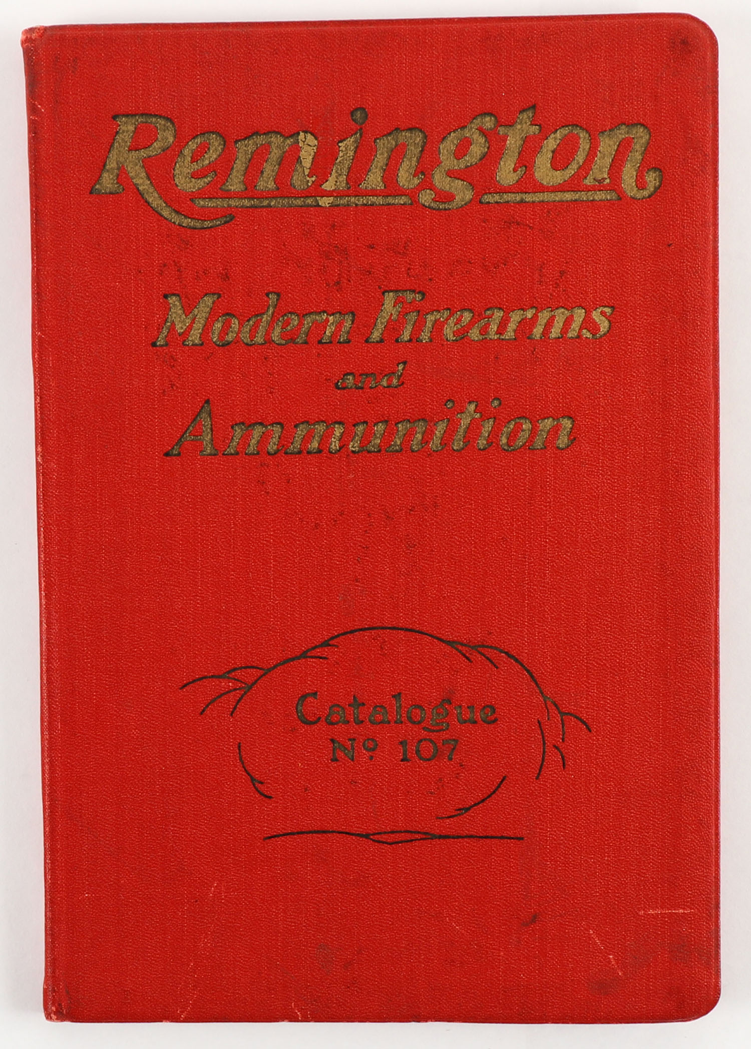 Remington Modern Firearms and Ammunition, No. 107, 1923, pictures Guns, Metallic Cartridges, Empty and Loaded Paper Shells, Primers, Gun Wads. 6'' x 9''. 196 pages, pages clean, binding tight, thin hard cover is nice, these were used by salesman and store managers. Grade: Excellent - Value: 30 to 200