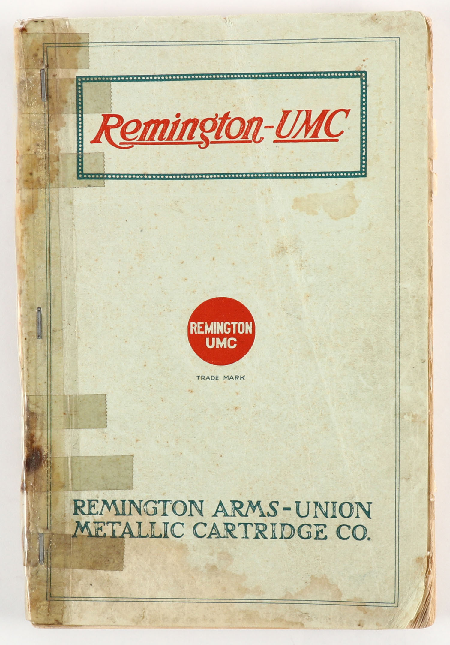 Remington-UMC Firearms and Ammunition, 1913-14, pictures Guns, Metallic Cartridges, Empty and Loaded Paper Shells, Primers, Gun Wads. 6'' x 9''. 212 pages, pages and cover shows wear& tape repairs, soft cover. Grade: Good ++ - Value: 10 to 60