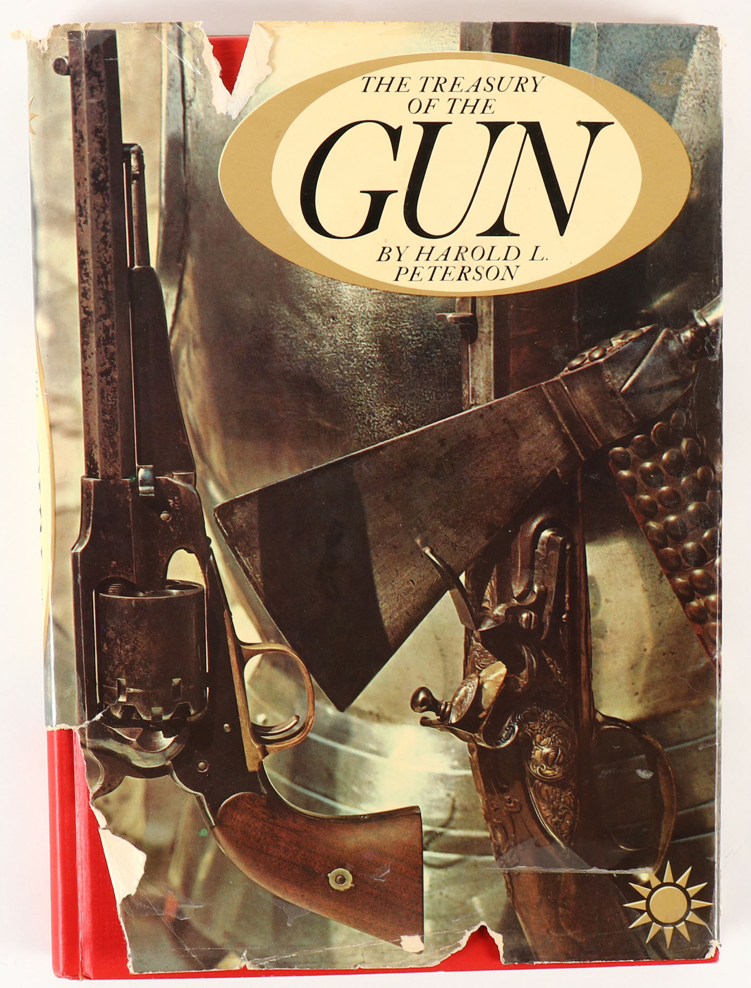 The Treasury Of The Gun by Harold L. Peterson, 1962, 8 1/2'' x 12'', 249 pages, b/w and color images, pages clean, binding tight, hardcover very good, dust jacket poor with large rips. Grade: Very Good - Value: 8 to 35