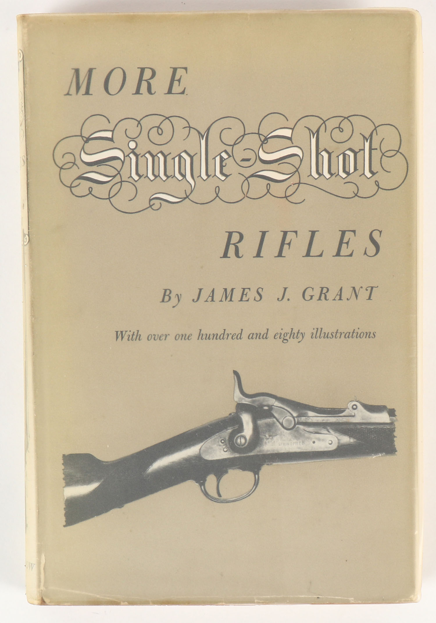 More Single Shot Rifles by James J. Grant, 1959, 6 1/2'' x 9 1/2'', 322 pages, pages clear with water spot on first blank page, b/w images, binding tight, hardcover very good, dust jacket, very good with plastic protection cover over it. Grade: Very Good ++ - Value: 20 to 60