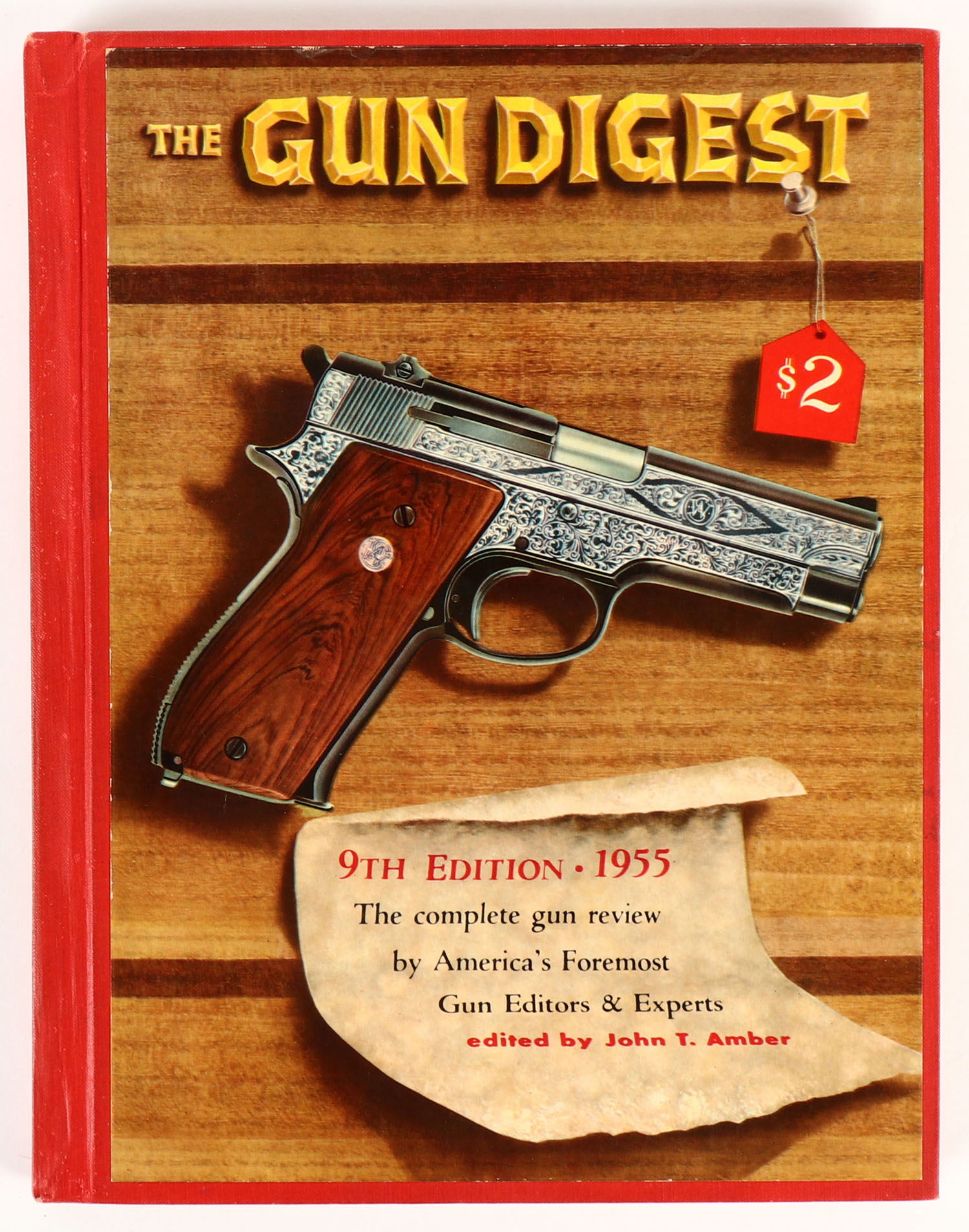 The Gun Digest 9th Edition by John T. Amber, 1955, signed copy, 9'' x 11 1/2'', 224 pages, b/w images, pages clean, binding tight, hardcover very good with some age soiling on the inside blank area. Grade: Very Good ++ - Value: 2 to 15