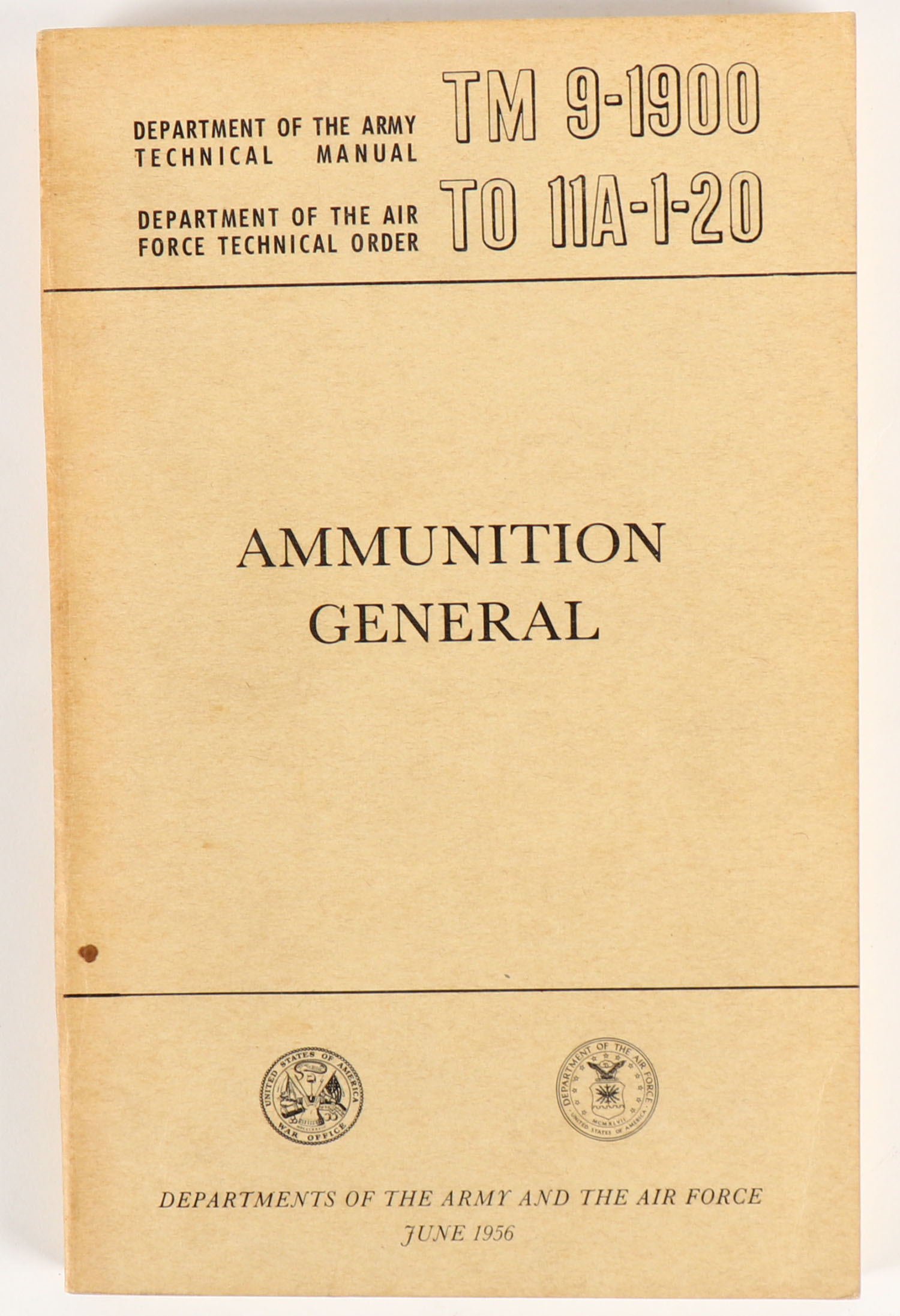Department Of The Army Technical Manual TM 9-1900 Combined With Department Of The Air Force Technical Order TO 11A-1-20 Ammunition General, 1956, 6'' x 9 1/2'', 319 pages, pages clean, binding tight, paper cover has age soiling around edges, color and b/w images. Grade: Very Good - Value: 10 to 100