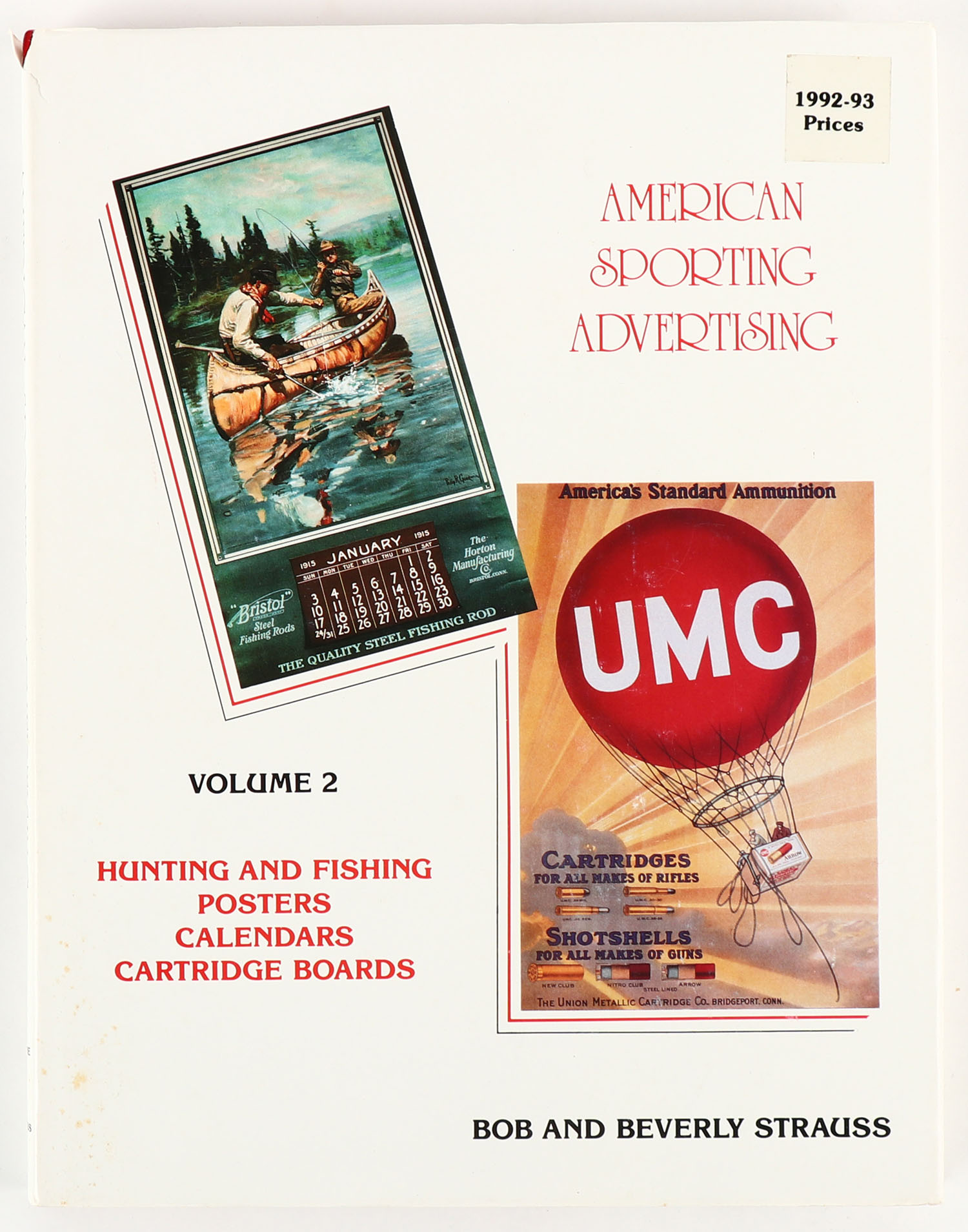 American Sporting Advertising Volume 2 by Bob And Beverly Strauss, 1990, 9'' x 11 1/2'', pages clean, binding tight, b/w images, hardcover excellent, dust jacket very good with some soiling and wear along edges. Grade: Excellent - Value: 10 to 50
