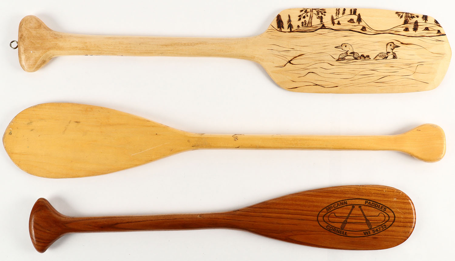 Lot of 3 salesman sample small canoe paddles, 23'' on the longest one. Grade: Excellent - Value: 20 to 100