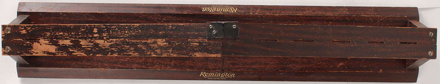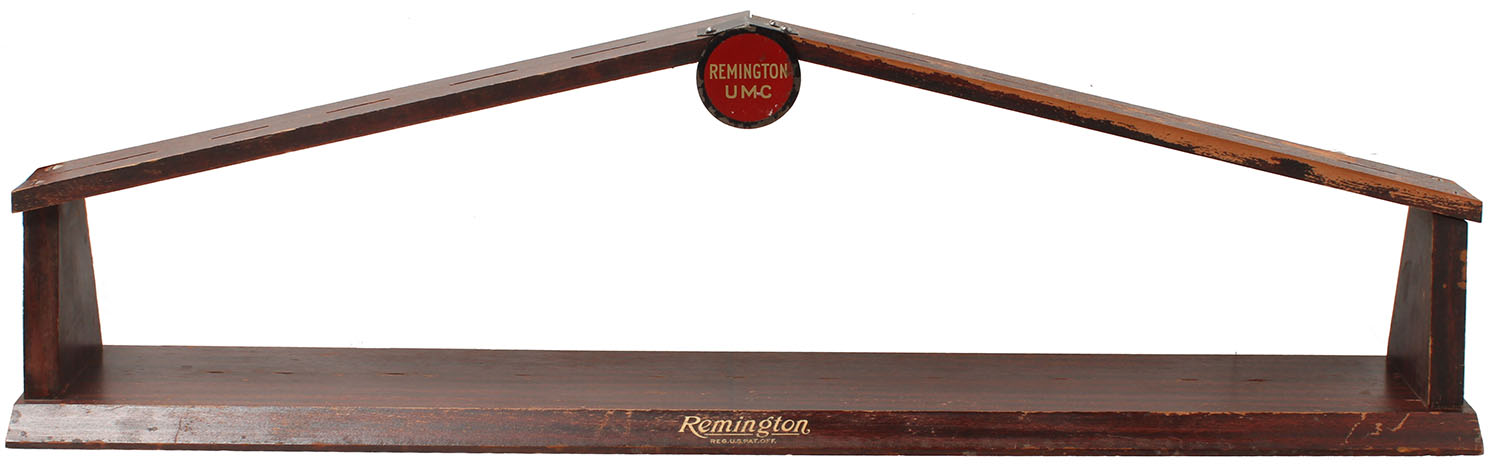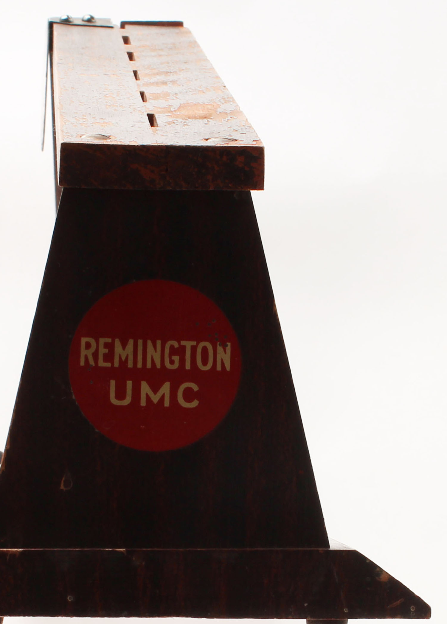 RARE Remington UMC Counter Knife display, has REM UMC red dot logo on each side, has Remington in gold lettering on the front & back of wood base, has heavy metal REM UMC red dot logo at the top, this was use to display kitchen knives from the top standing upright, holds 11 total knives, 33'' x 9 1/2'', shows some wear to surface paint only & most of that is to the top, Very Rare & only one we have seen! Grade: Excellent - Value: 250 to 500