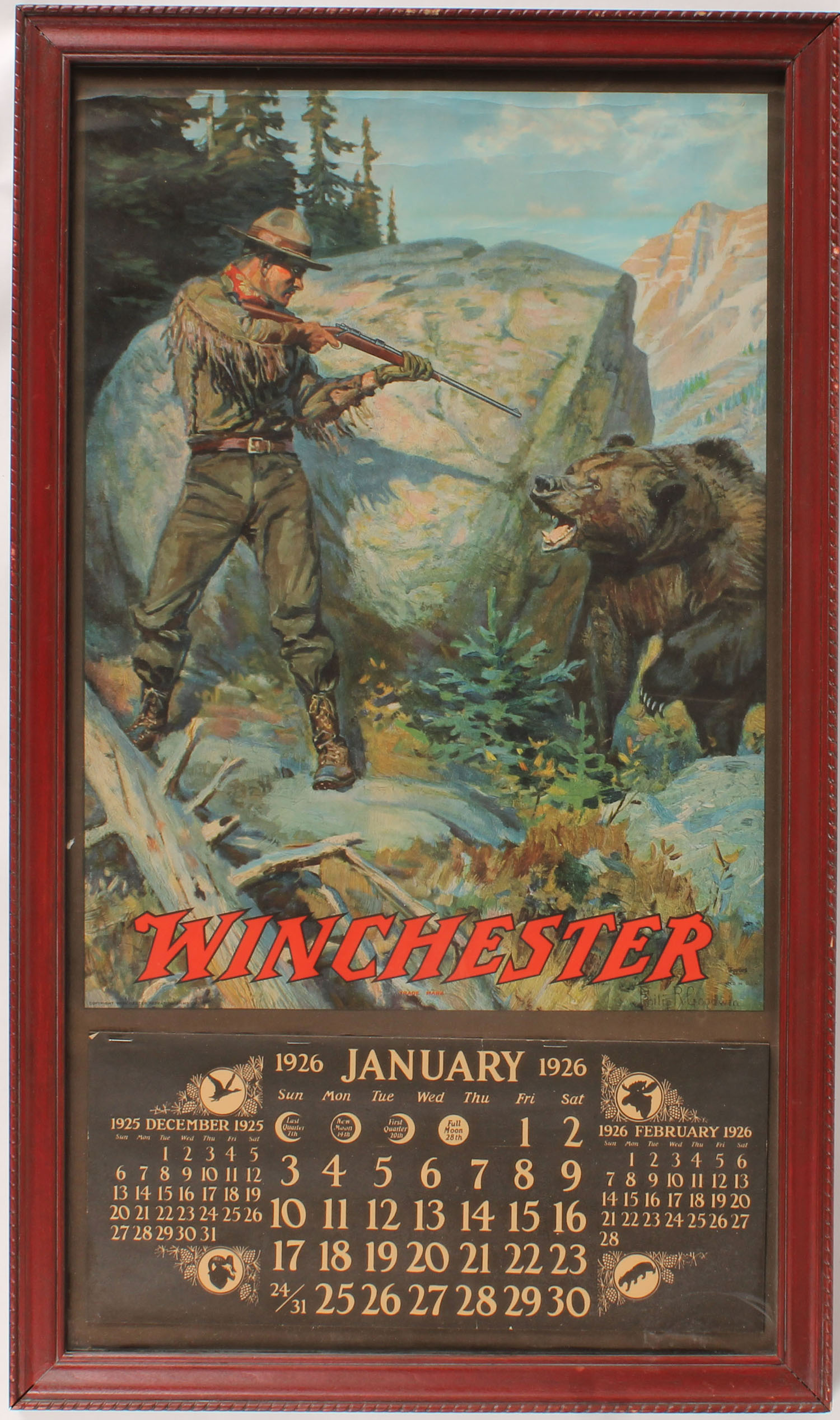 1926 Winchester Calendar by Phillip R. Goodwin, pictures a dramatic scene with hunter in red bandana shooting at a grizzly bear at close quarters, this is the 3rd and final calendar done by Philip R Goodwin & the most valuable one in near mint condition, has both metal bands & brass hanger, Full Pad of Pages, 14 5/8'' x 26 1/4'', Framed, very collectible & hard to find. Grade: Excellent ++ - Value: 3000 to 6000