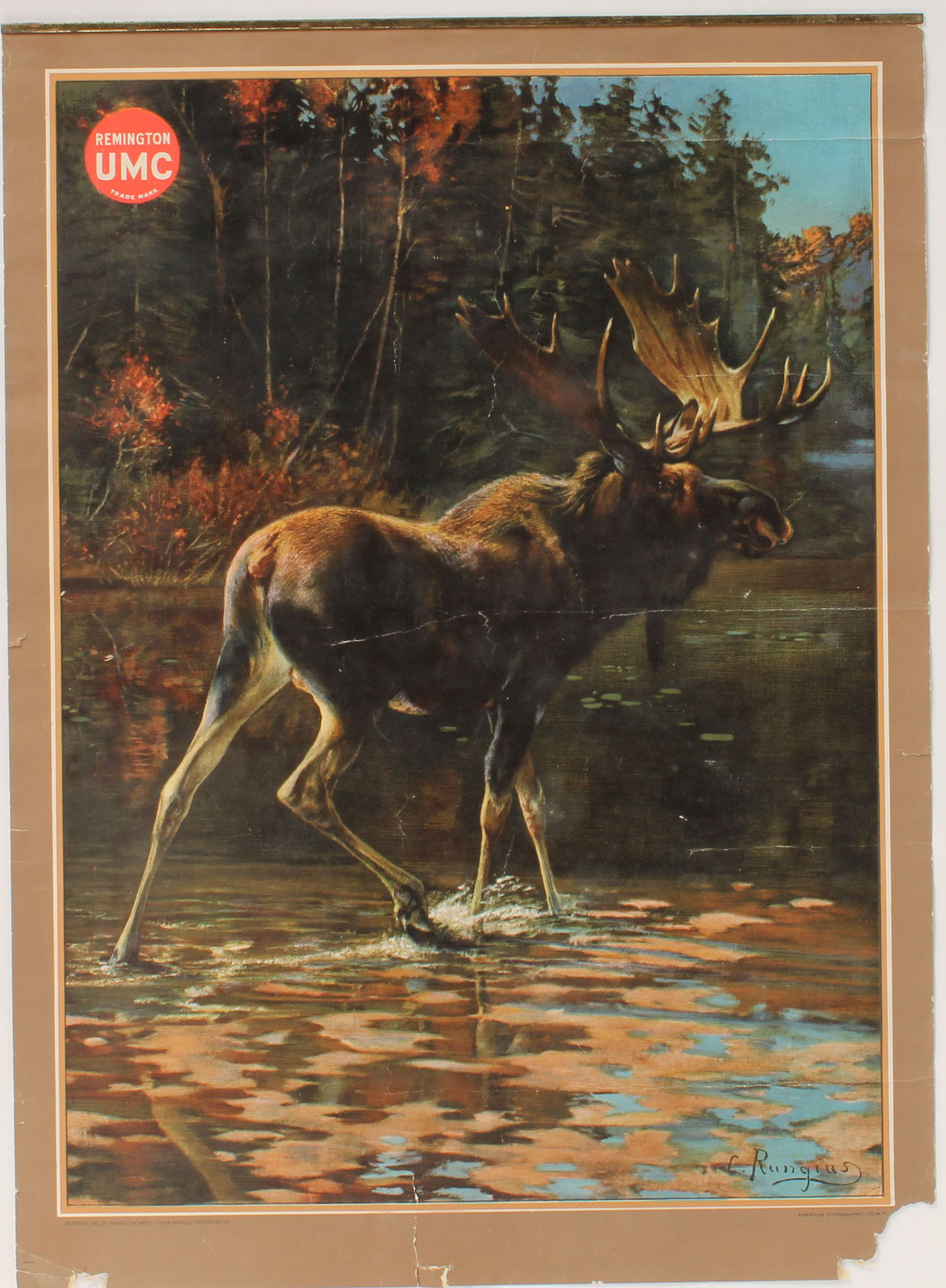 1913 Remington UMC Calendar top, by C. Rungius, pictures a bull moose at lakes edge, 15'' x 20 1/2'', brass top band with hanger, has wonderful colors with some edge wear. Grade: Excellent - Value: 150 to 300