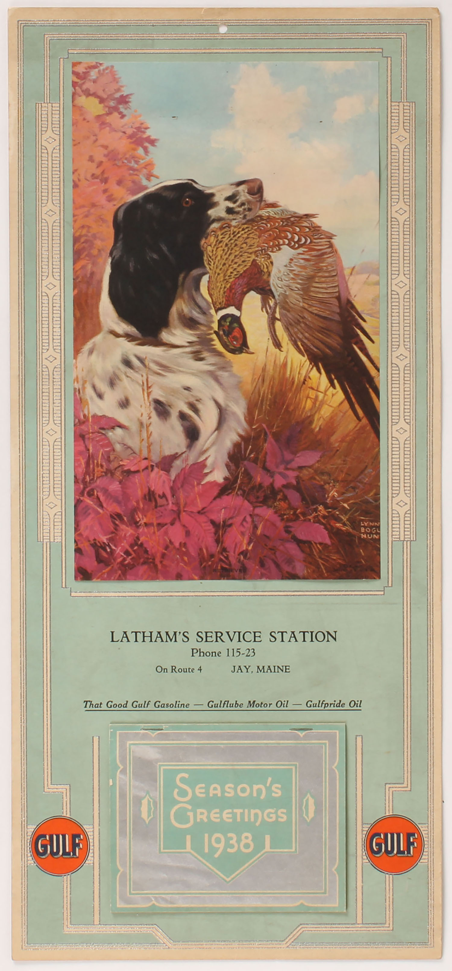 1938 Lynn Bogue Hunt calendar, promotes, GULF GAS, full color image of setter & a rooster pheasant in his mouth, 9'' x 20 1/4'', full pad of pages. Grade: Excellent - Value: 10 to 100
