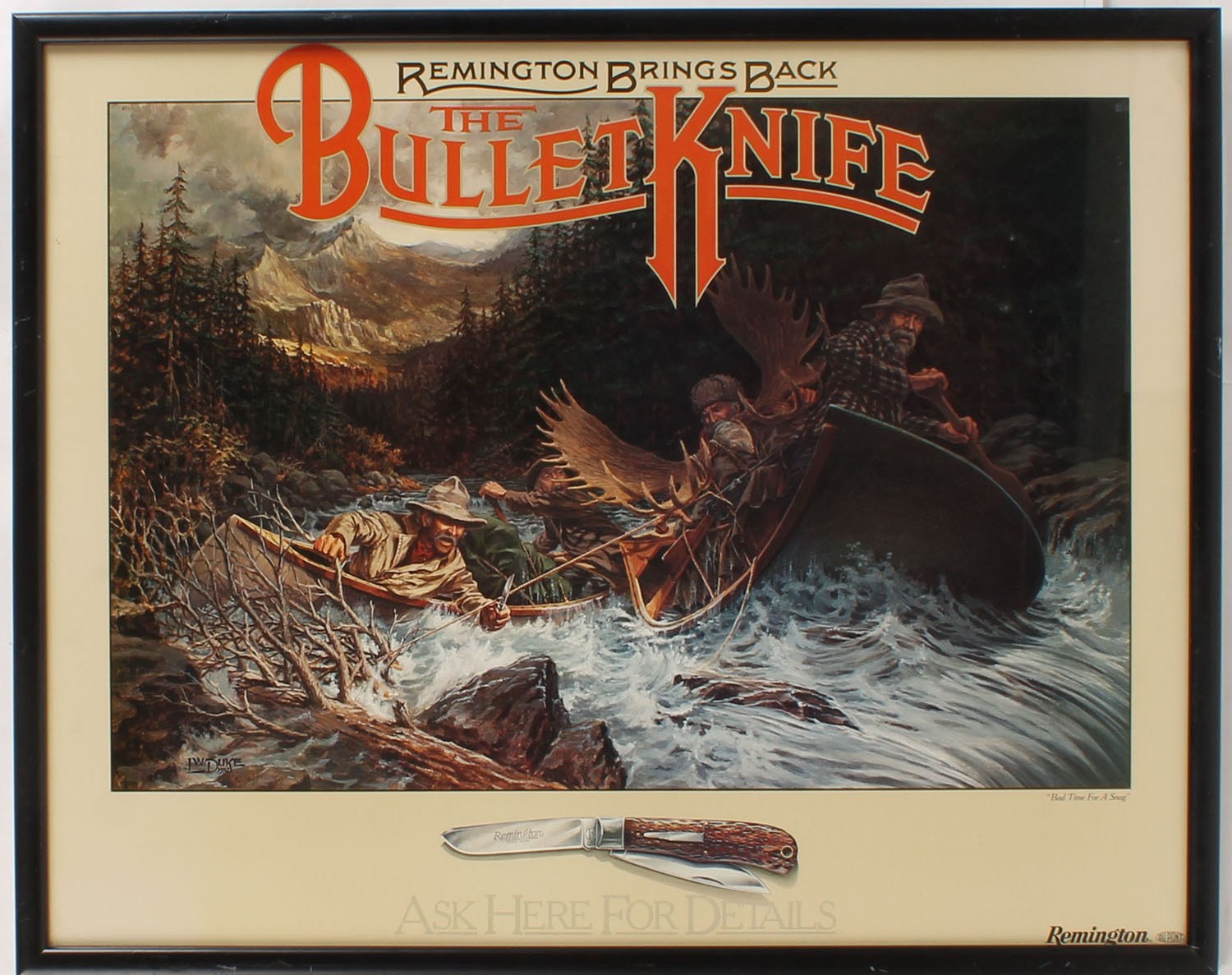 Remington Bullet Knife Poster, ''Bad Time For A Snag'', near perfect condition, pictures moose hunters snagged on a log while rafting in canoes down river, 24''x 20'', framed. Grade: MINT - Value: 40 to 200
