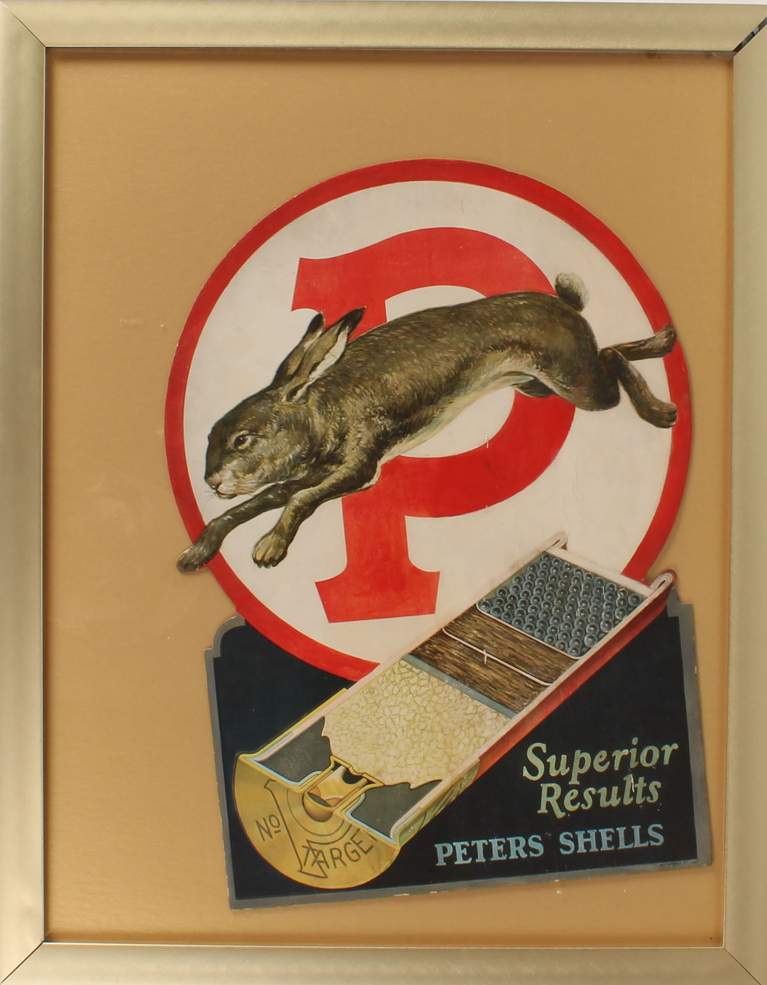 Peters Diecut ''SUPERIOR RESULTS PETERS SHELLS'', pictures Cut-A-Way shotshell with rabbit jumping, has been professionally touched up, 14'' x 21'', framed. Grade'' Very Good ++ - Value: 200 to 900