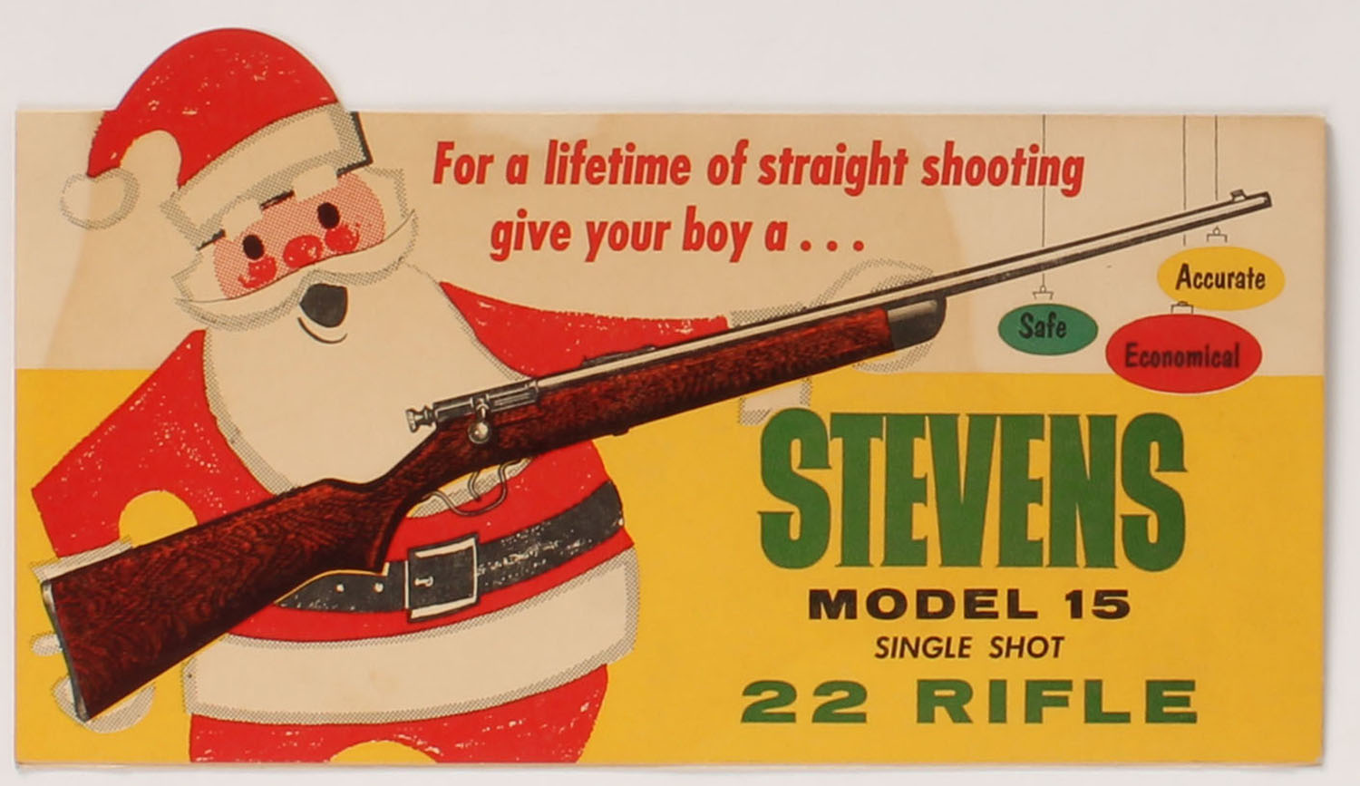 Stevens fold out counter display for Christmas, pictures Santa Clouse holding a Model 15 single shot .22 rifle, 11 1/2'' x 6 1/2''. Grade: Excellent + - Value: 50 to 250