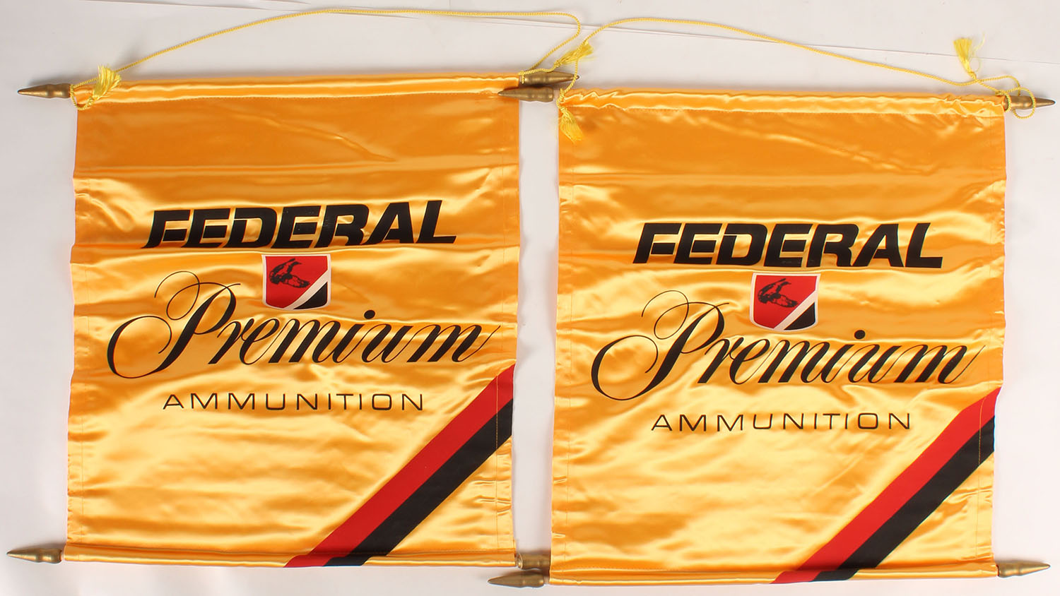 Lot of 2 Federal banner, ''FEDERAL PREMIUM AMMUNITION'', gold, red & black, all complete, 20'' x 23''. Grade: MINT - Value: 60 to 150