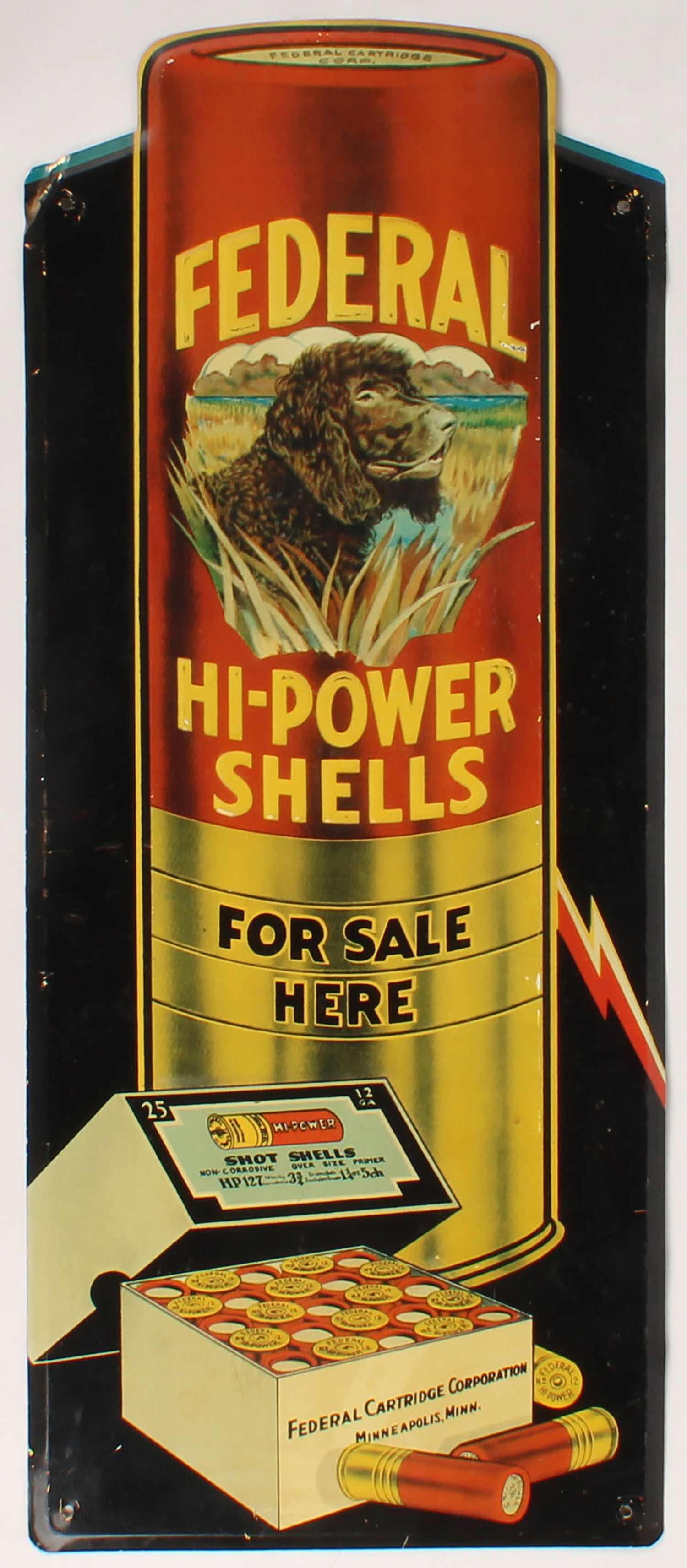 Federal HI-POWER SHELLS FOR SALE HERE, metal sign, pictures a large shot shell with retriever at top & 2pc shotshell box at bottom, very nice color with light wear, 11 1/2'' x 28''. Grade: Very Good ++ - Value: 40 to 200