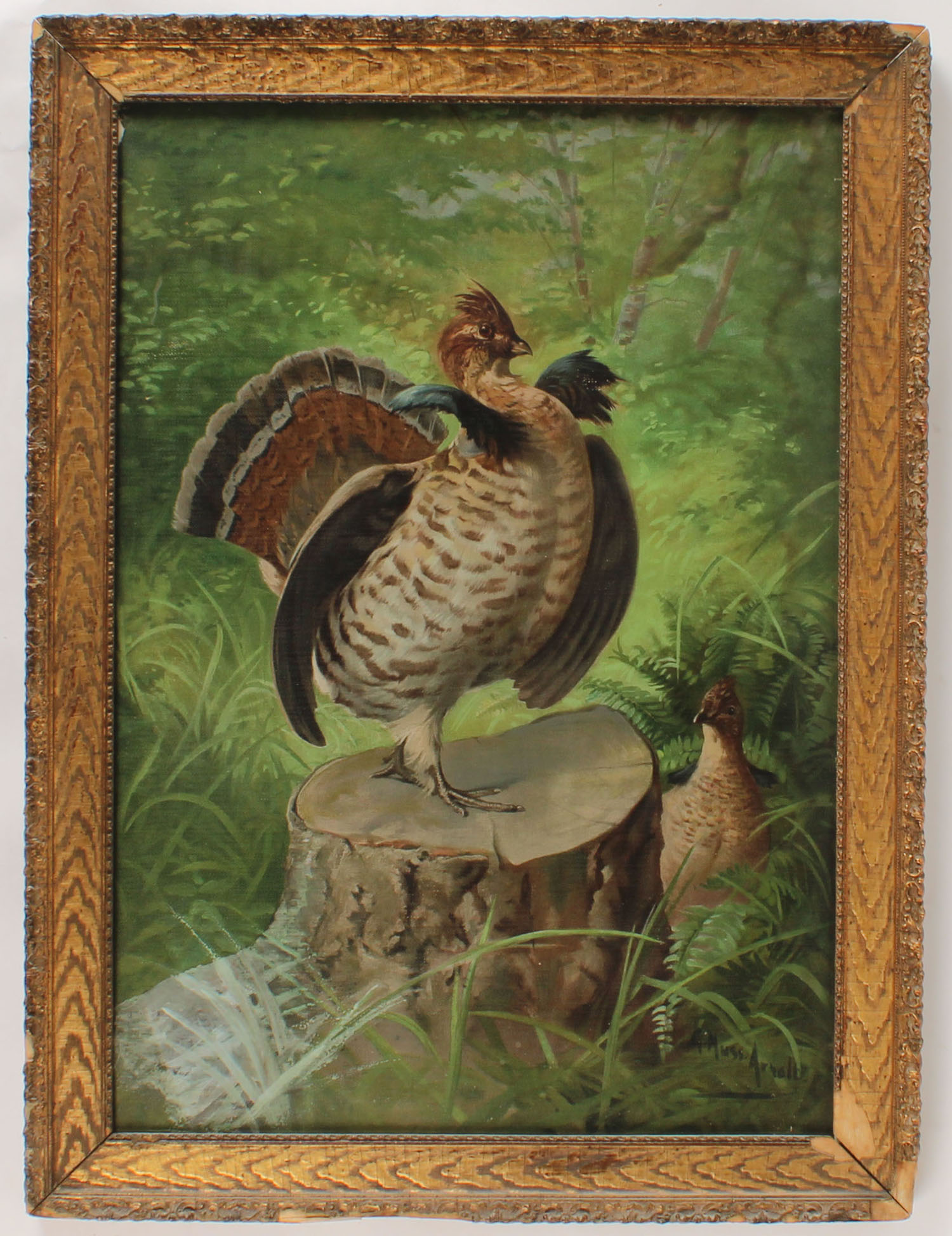 G. Muss Arnolt print pictures Ruffed Grouse in the woods, image size 17'' x 24'', framed. Grade: Excellent - Value: 50 to 250