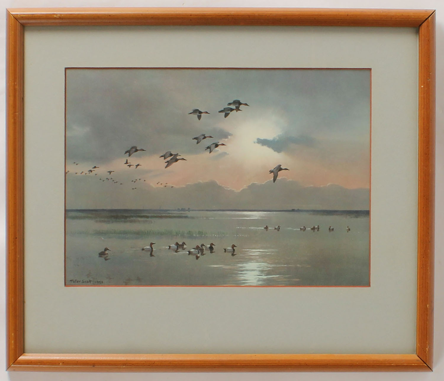 1952 Peter Scott print ''Canvasbacks on a still afternoon'', pictures canvasbacks over water, image size 14'' x 10'', framed. Grade: Excellent ++ - Value: 10 to 100