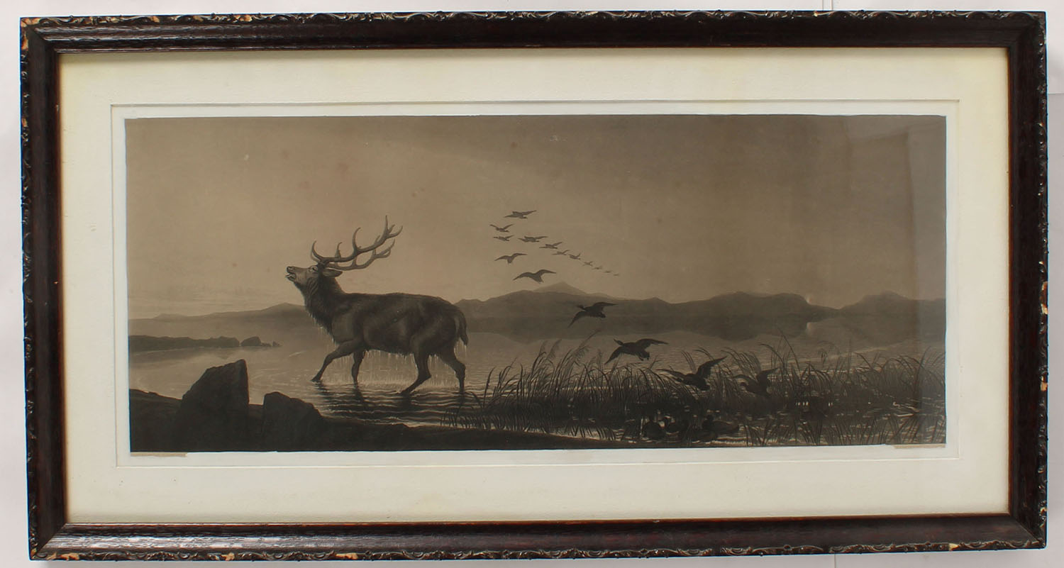 After SIR E. LANDSEER, 19th century,. The scene depicting a bull elk and flying ducks, the bottom left corner with 'PAINTED BY SIR E. LANDSEER' and the bottom right corner with 'ENGRAVED BY J.W. WATTS', image size 27'' x 11''. Grade: Very Good - Value: 50 to 500
