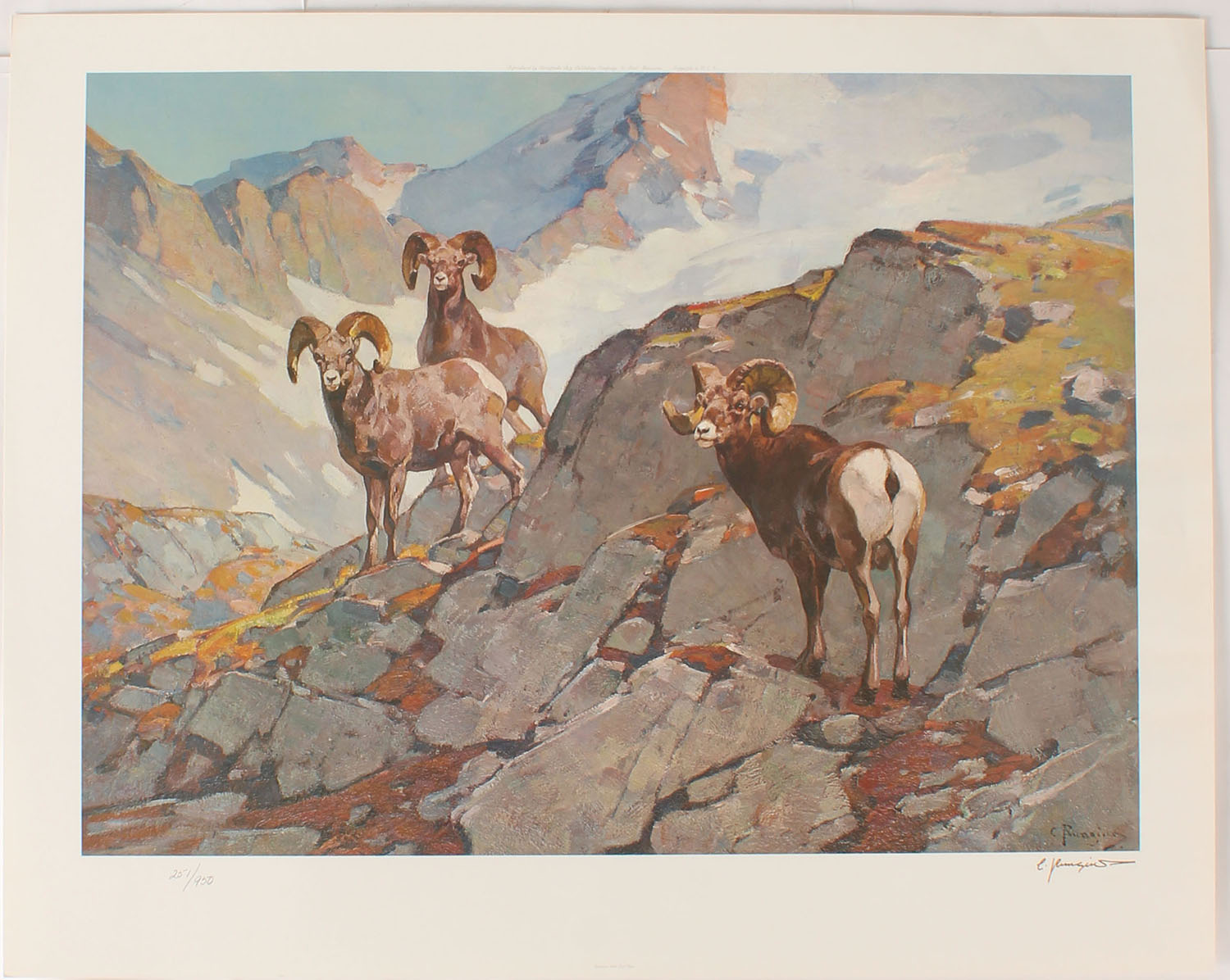 RARE Carl Rungius BIG HORN SHEEP print (American 1869-1959), art signed in gold, this is a L.E. 251/950. Measures 30.5'' X 24'', wonderful full color image of three big horn sheep on mountain. Grade: MINT - Value: 50 to 500