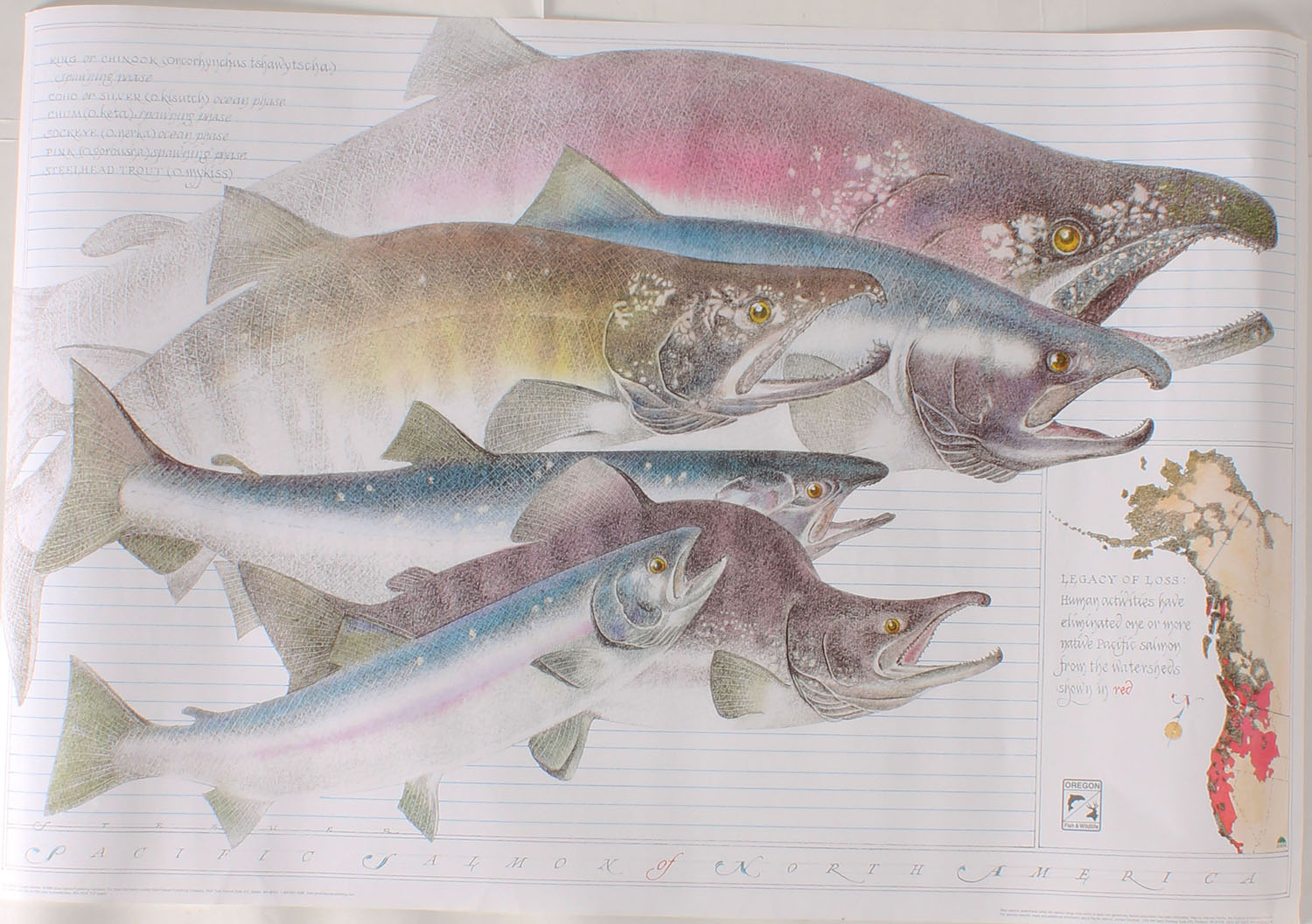 Pacific Salmon of North America print, pictures 6 salmon with a chart of where humans have had an effect on them in the western part of the USA, 1998 eco trust. 36'' x 24'', has original mailing tube. Grade: MINT - Value: 20 to 100