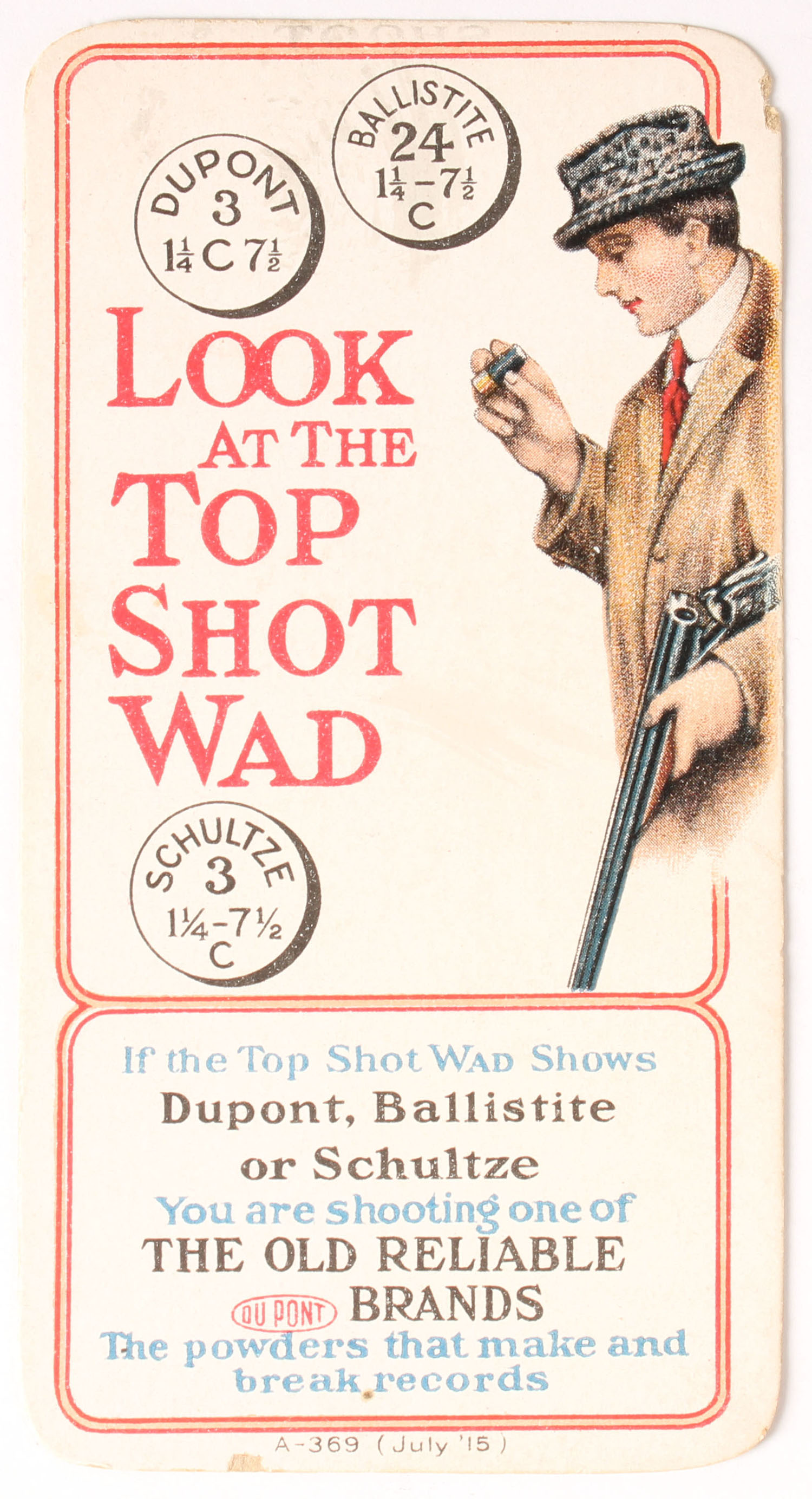 Dupont Ballistite Score Card, unused, has near mint image of trapshooter, back side has unused score card, 2 3/4'' x 5''. Grade: Excellent ++ - Value: 10 to 50