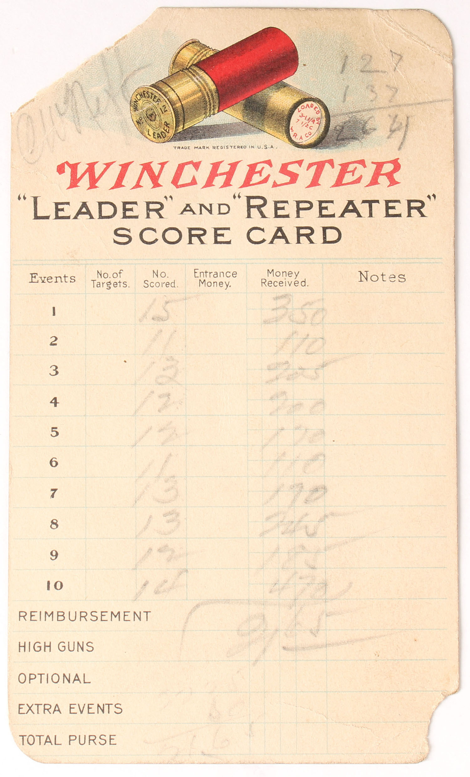 Winchester Leader and Repeater Score Card, used, has image of trapshooting scene, shows wear & scuffing, 3'' x 5 1/2''. Grade: Good + - Value: 6 to 30