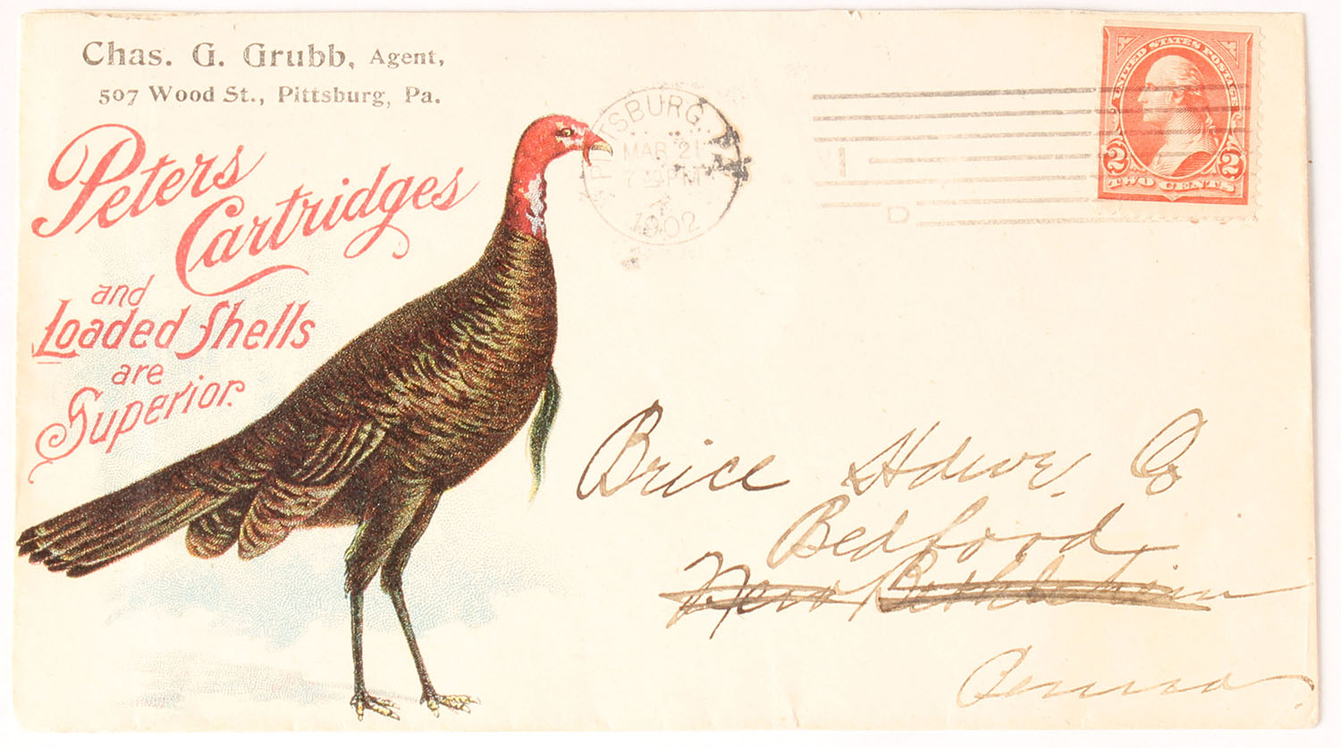 RARE Peters Cart. Co. Envelope, dated 1902, pictures full color image of wild turkey tom, very colorful back as well. Grade: Excellent - Value: 100 to 300