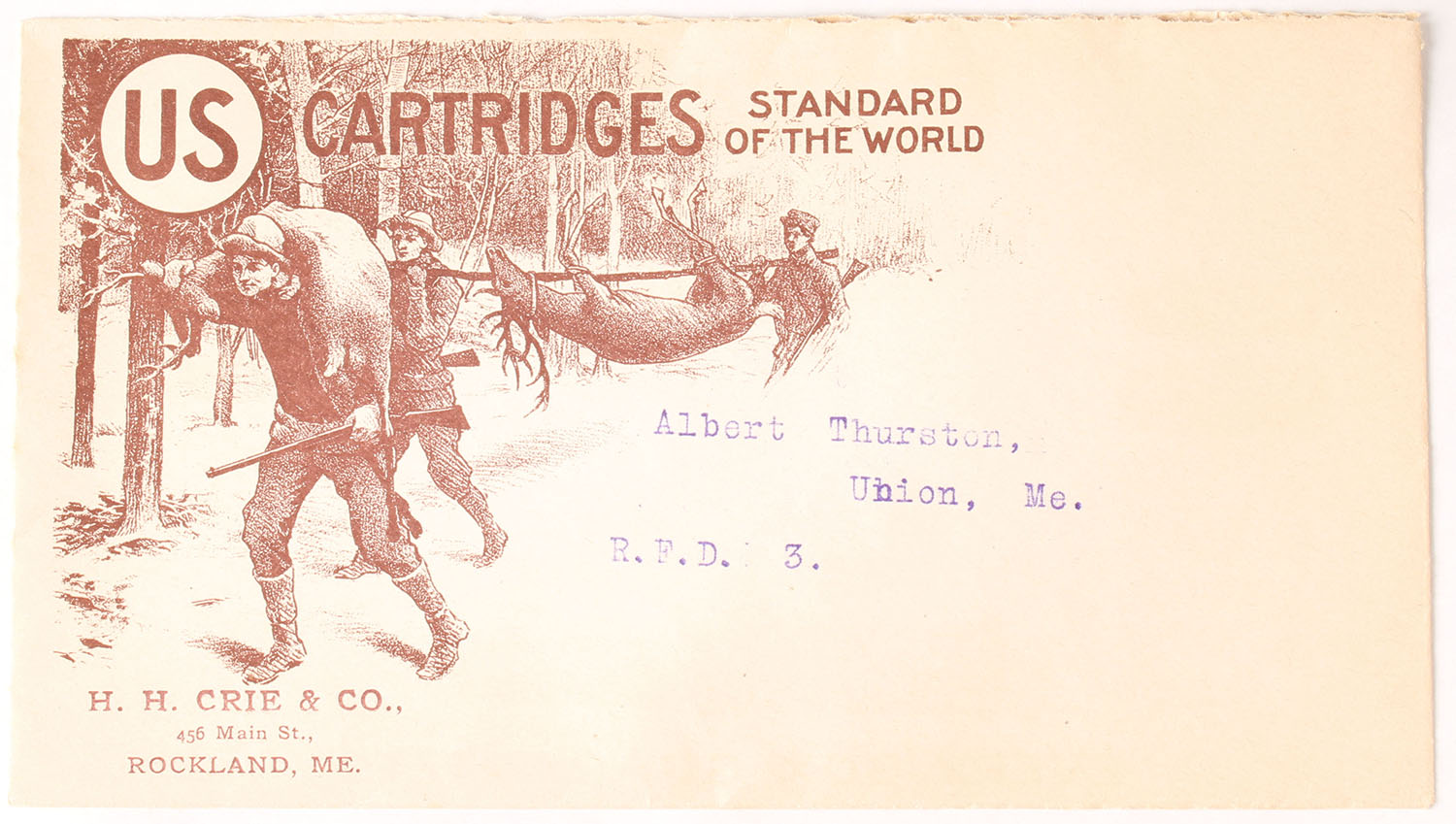 U.S. Cart. Co. Envelope pictures deer hunters bringing back two buck deer. Grade: Excellent - Value: 30 to 90