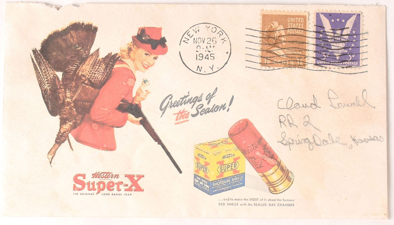 Western Super-X Envelope, dated 1945, pictures lady with shotgun & a wild turkey on her back. Grade: Excellent - Value: 20 to 80