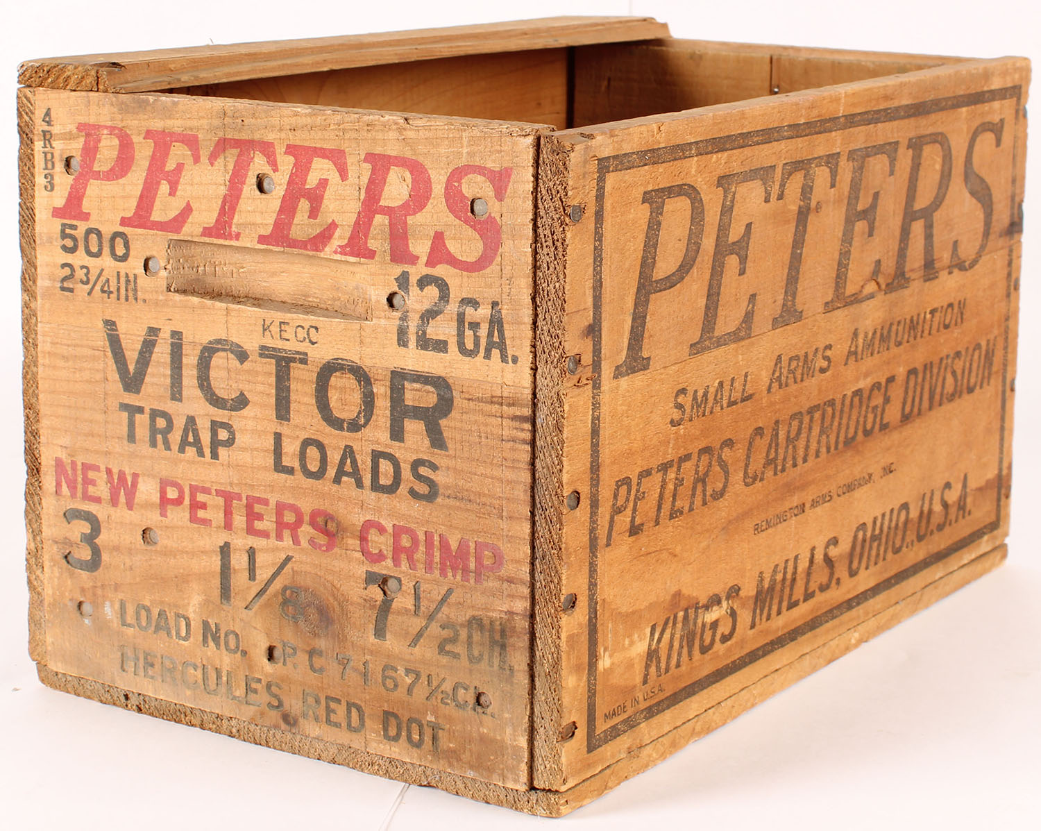 Peters wood shipping crate, Victor Trap Loads, 12 ga., 7 1/2 shot, nail construction, black & red print is solid, crate is solid, Grade: Very Good ++ - Value: 30 to 60