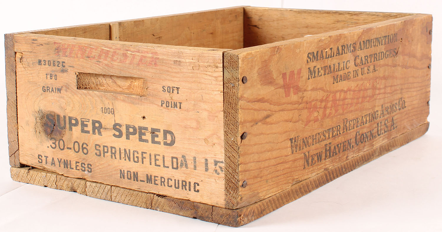 Winchester Super Speed, 30-06 Springfield, nail construction wood shipping crate, black & Red print is fading, crate is solid. Grade: Excellent - Value: 16 to 50