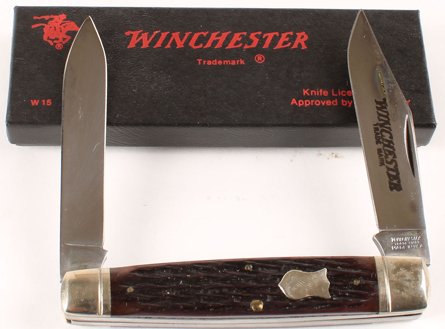 Winchester knife in orignal box, W 15 2913 1/4, celliod handles. Grade: Excellent ++ - Value: 30 to 90