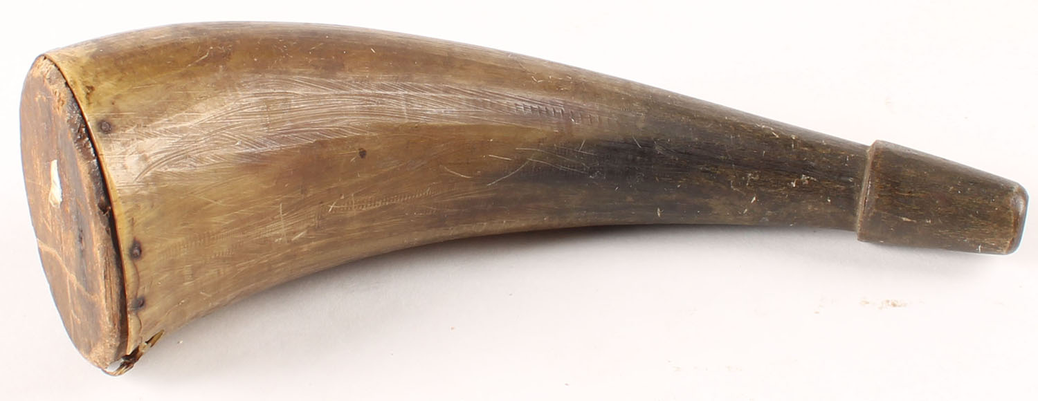 Powder horn, unmarked, 8'', age soiling and cracks on top. Grade: Very Good - Value: 4 to 50