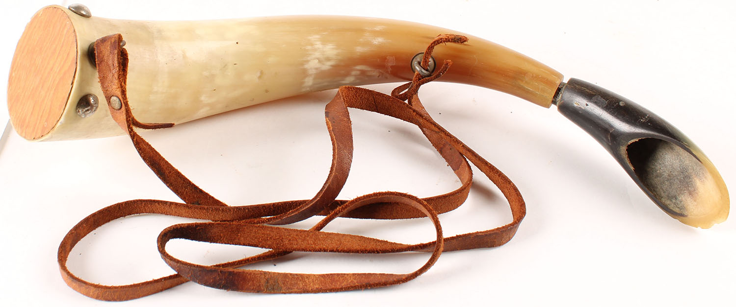Powder horn and leather strap, powder horn, 14'', very bright and clean. Grade: Excellent ++ - Value: 20 to 100