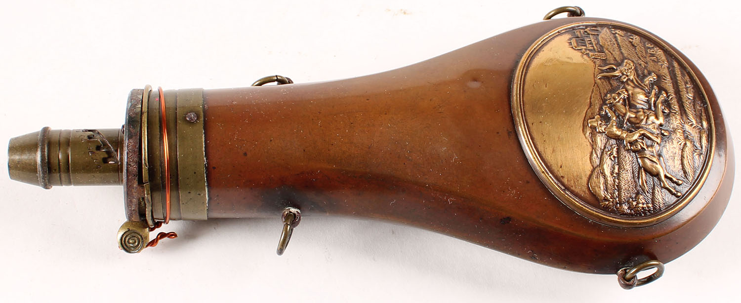 Brass Powder flask, unmarked with beautiful design, has age soiling Grade: Very Good - Value: 20 to 80