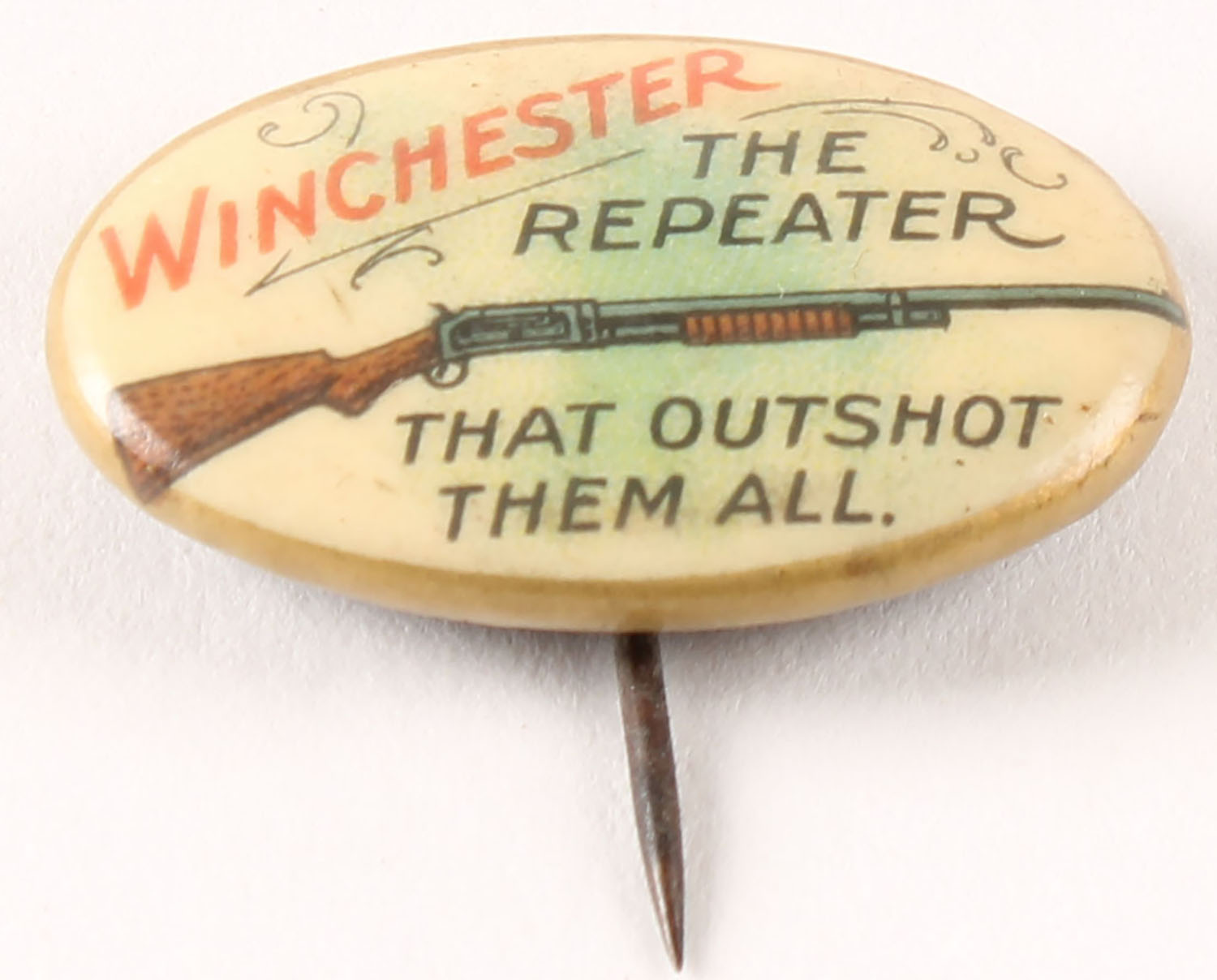 RARE! Winchester oval pinback, has rust to edges whitehead & Hoag paperback. Grade: Excellent - Value: 100 to 200