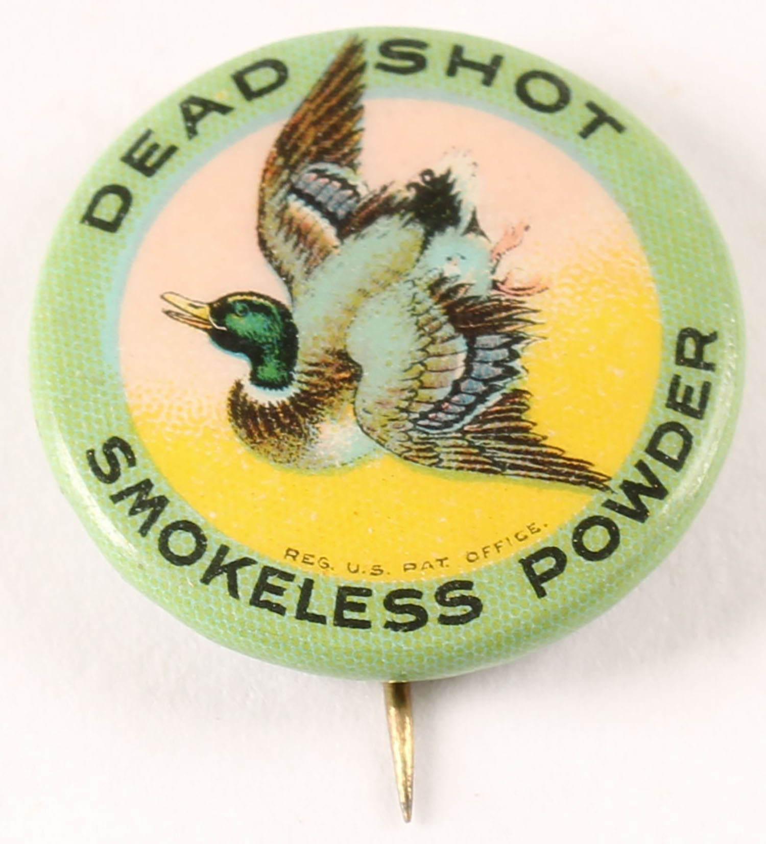 Dead Shot smokeless powder pinback, Bastain and Bros paperback. Grade: Excellent ++ - Value: 10 to 50