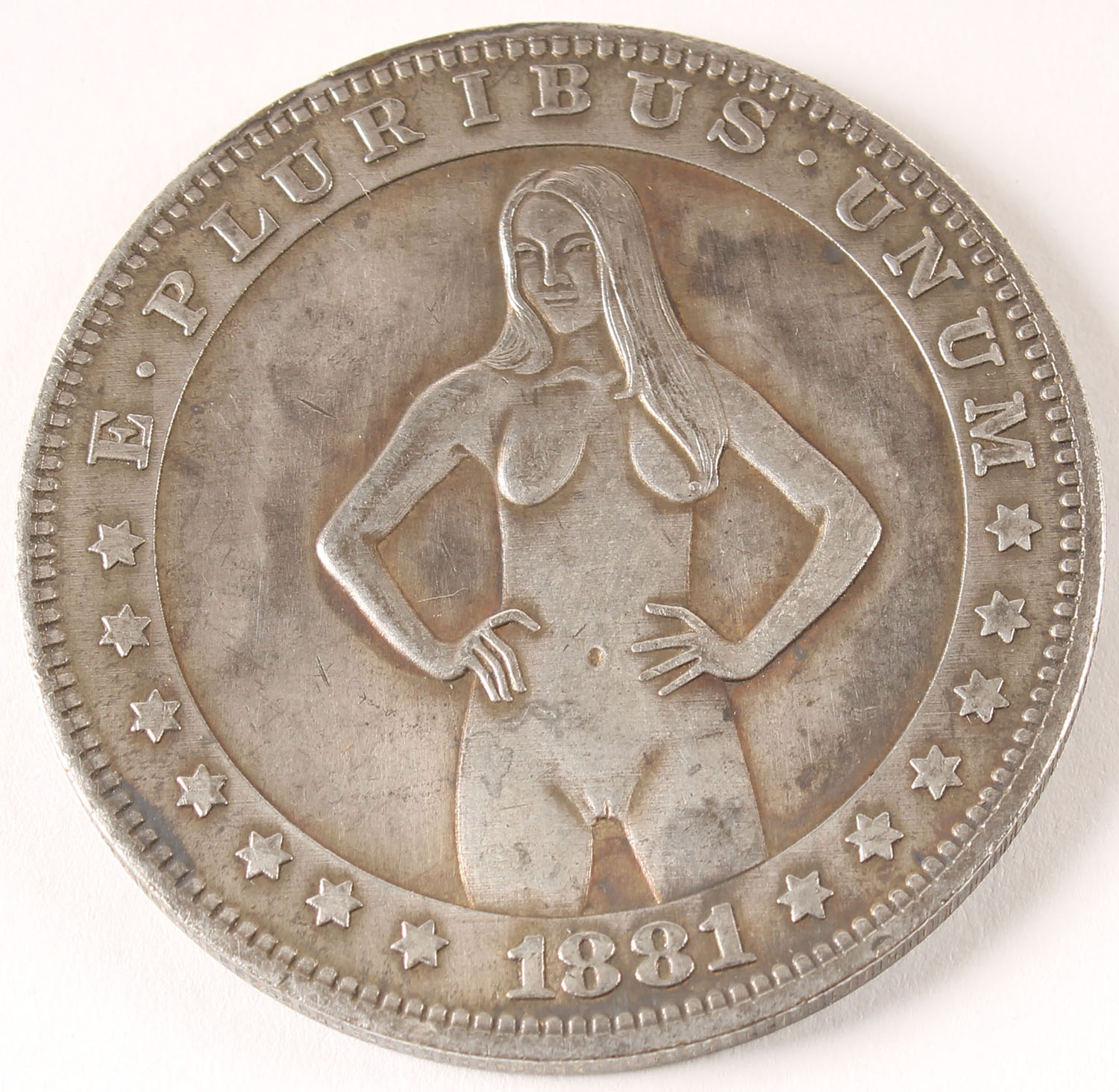RARE! 1881 nude silver dollar coin with eagle on back. Grade: Excellent - Value: 100 to 400