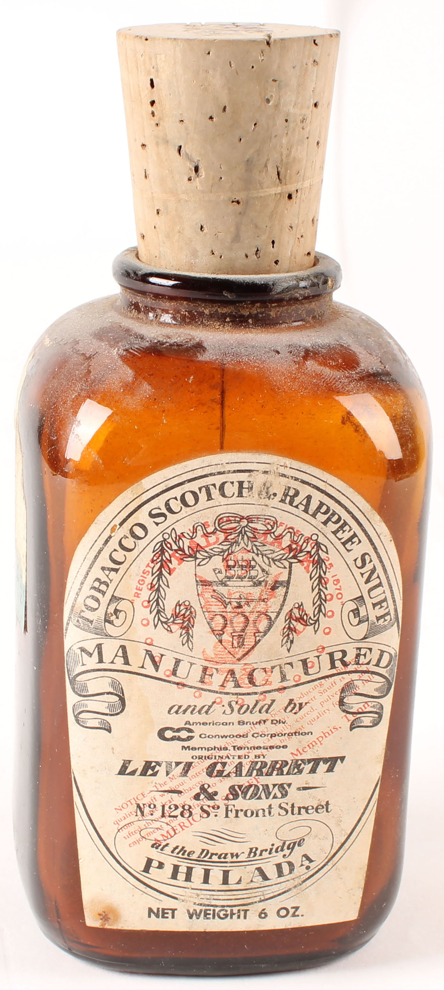 tobacco glass jar, Tobacco Scotch & Rappee Snuff, empty. Grade: Very Good ++ - Value: 20 to 100