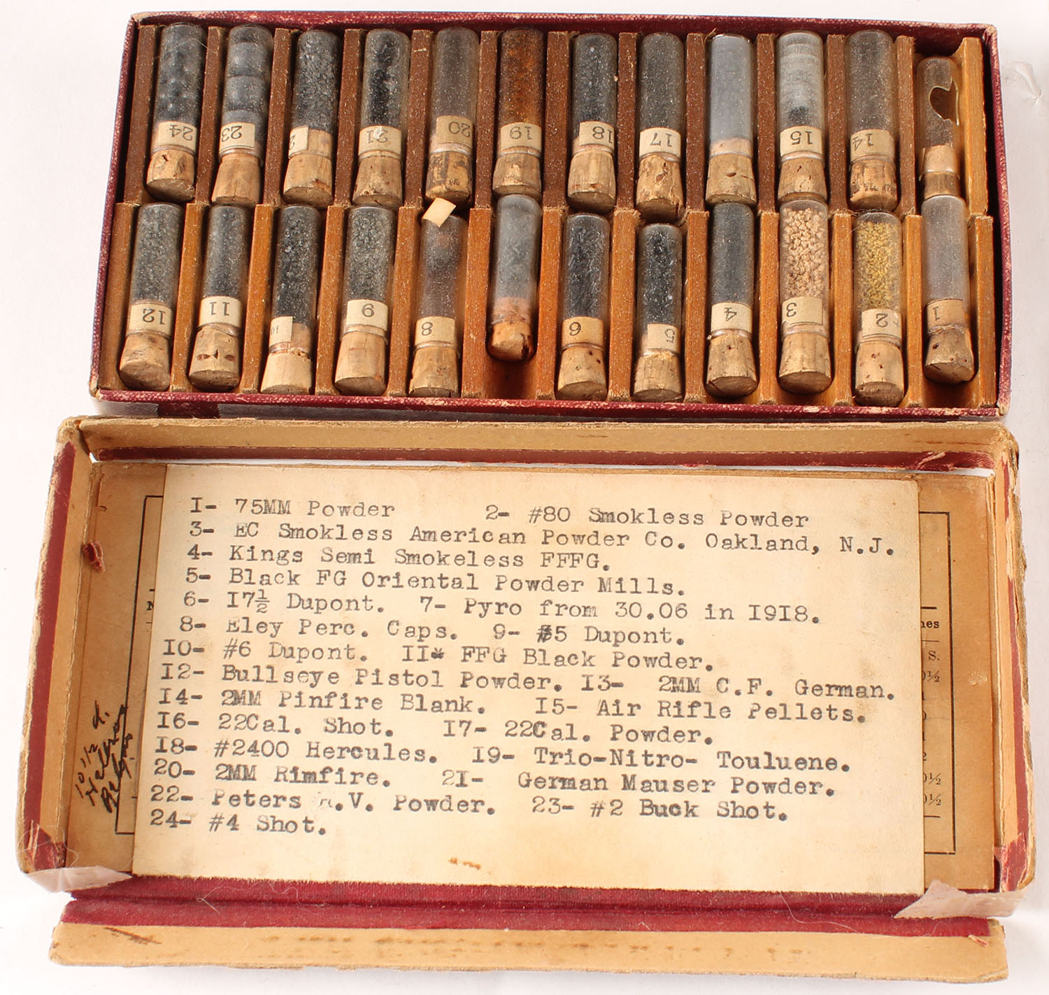 Set of antique powder, 24 different, with a list of the type of powder. Grade: Very Good - Value: 20 to 200