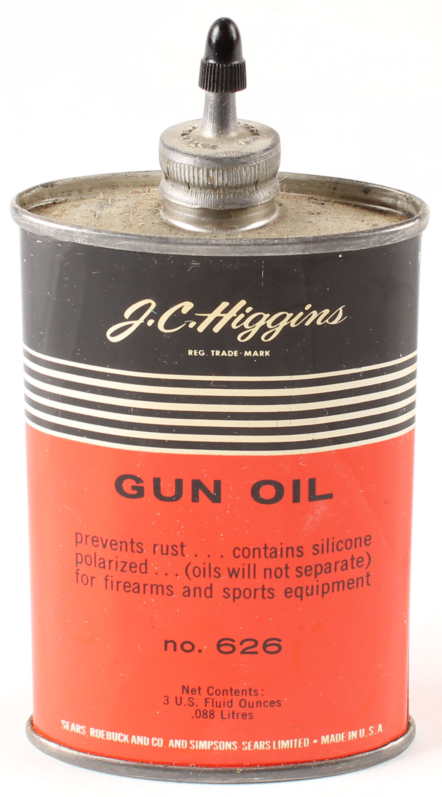 JC Higgins Gun oil tin, lead spout and cap , Partial. Grade: Excellent + - Value: 10 to 50