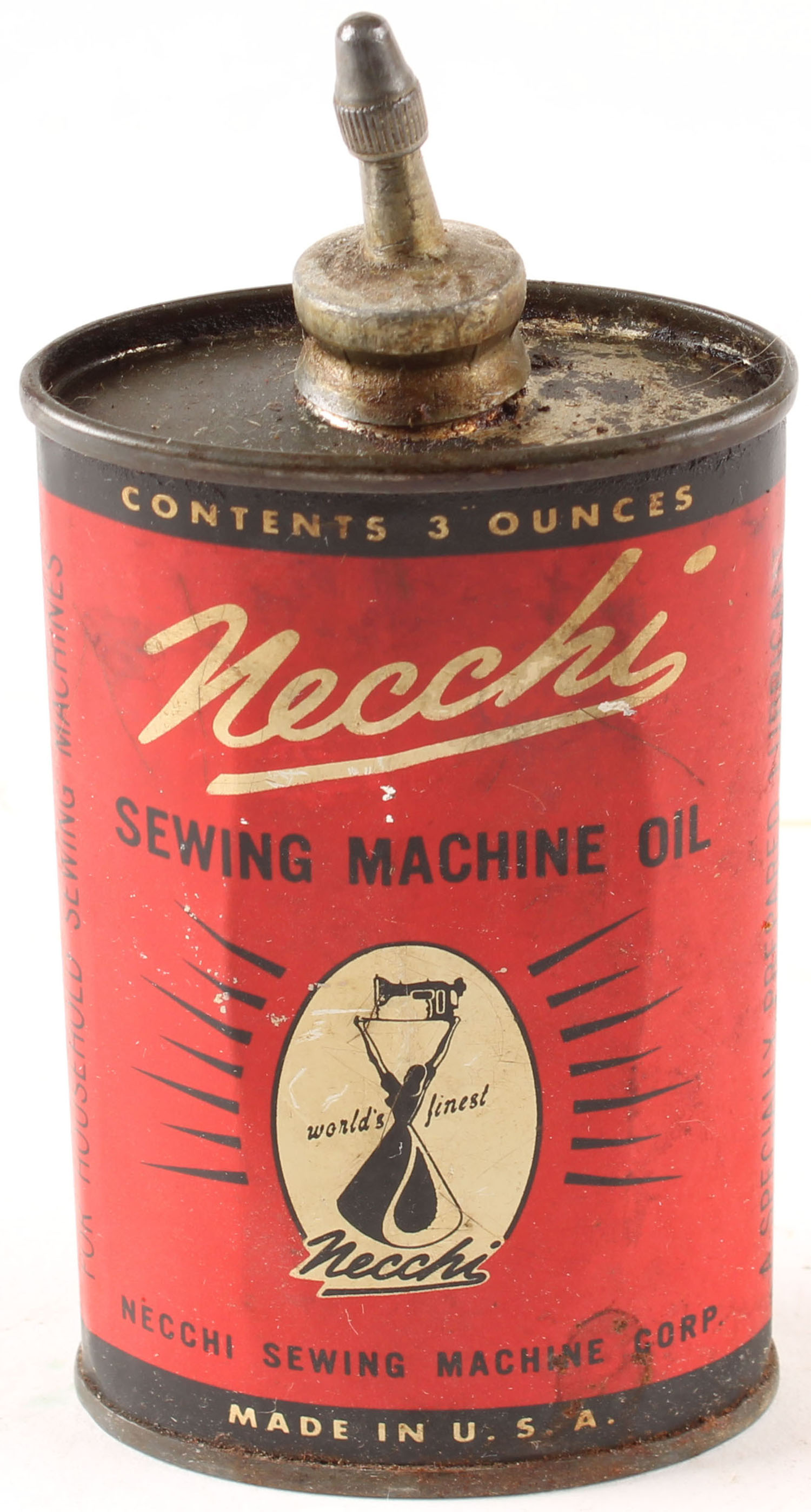 Neccchi sewing machine oil tin, lead cap and spout. Grade: Excellent - Value: 10 to 50