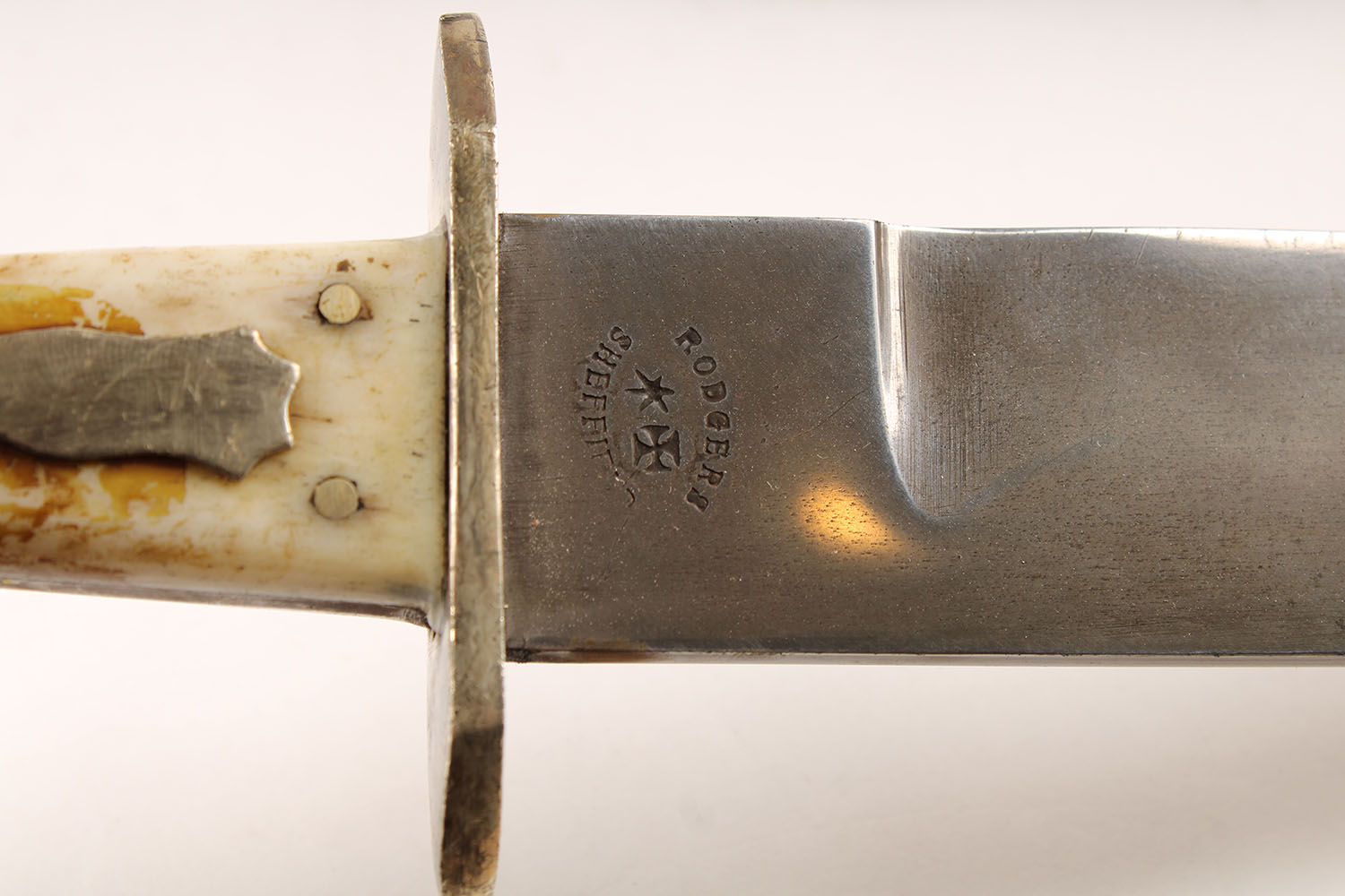 RARE! EARLY! ''Rodgers Sheffield'' Bowie Knife, full hilt, horn handle, 10'' blade, has orignal leather and metal sheath!, Still very solid. Grade: Excellent - Value: 400 to 1000