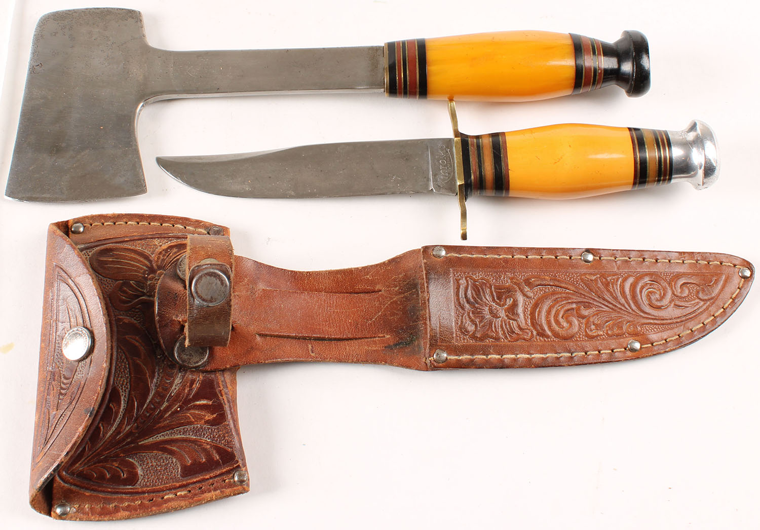 Set of knife and hatchet set, Kinfolks, with leather sheath, all solid! Grade: Excellent - Value: 40 to 150