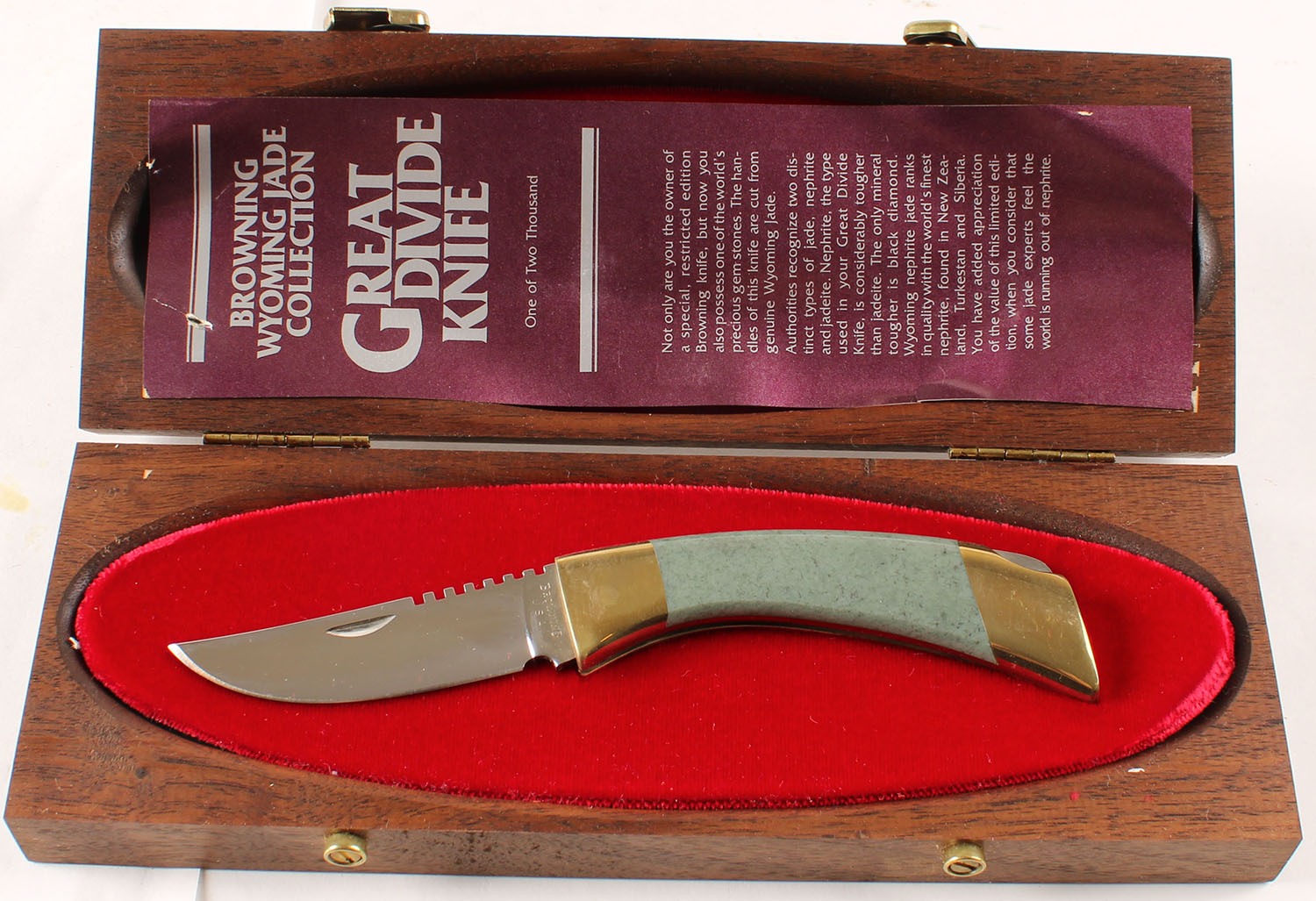 Browning Great Divide knife folding blade in original box, has satin polished jade handle, 3'' blade, unused. Grade: MINT - Value: 100 to 200