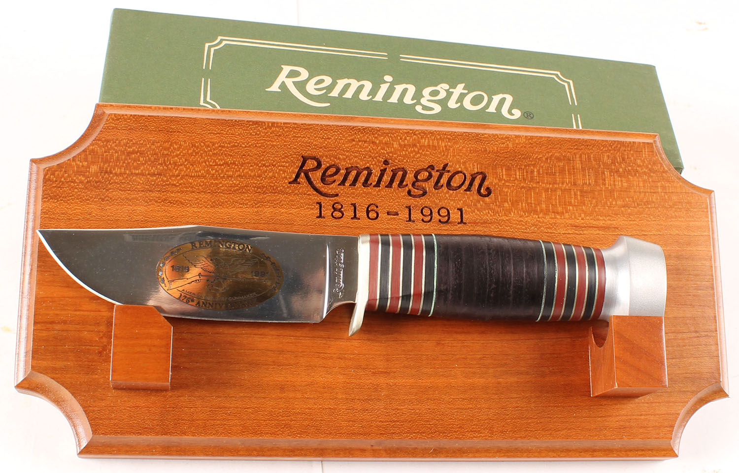 Remington fixed blade knife, 175th Anniversary Hunting knife, in box, half hilt, leather handle, aluminum hilt, 4'' blade, RH33C, comes with wood display rack. Grade: Excellent ++ - Value: 50 to 100