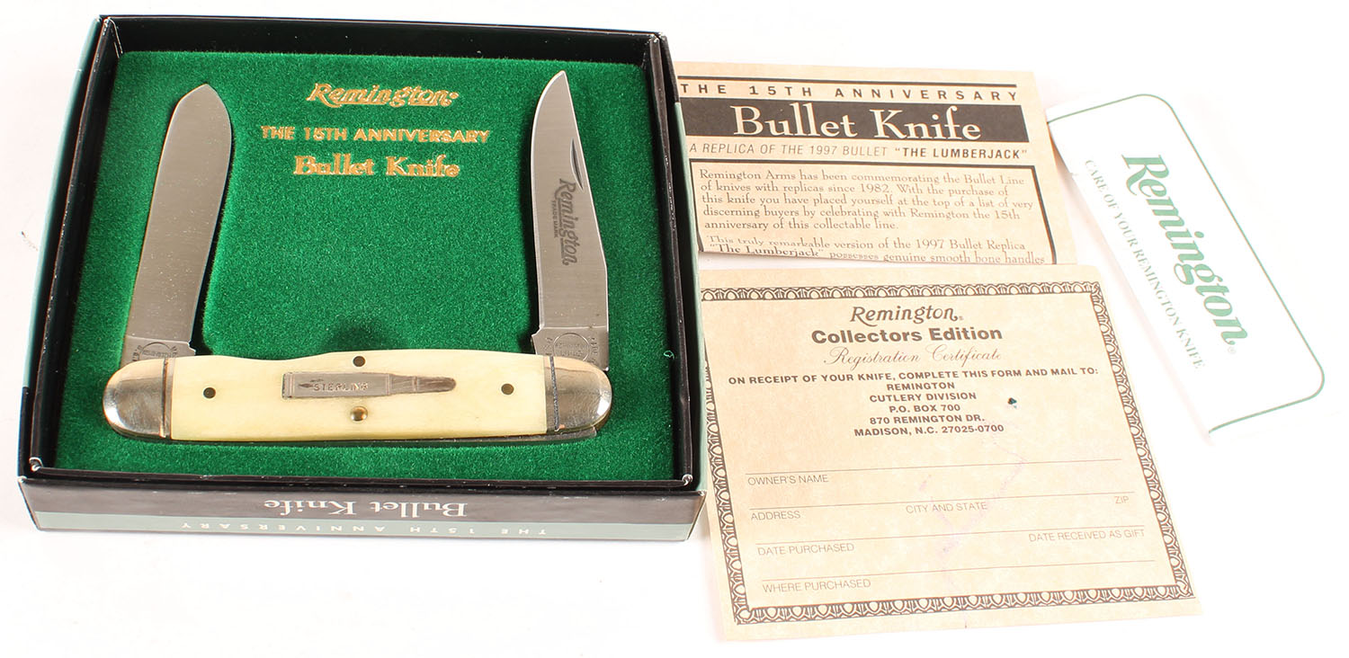 Remington 15th anniversary Bullet knife folding blade knife, in box, 2 1/2'' blades, sterling silver bullet. Grade: Excellent ++ - Value: 40 to 90
