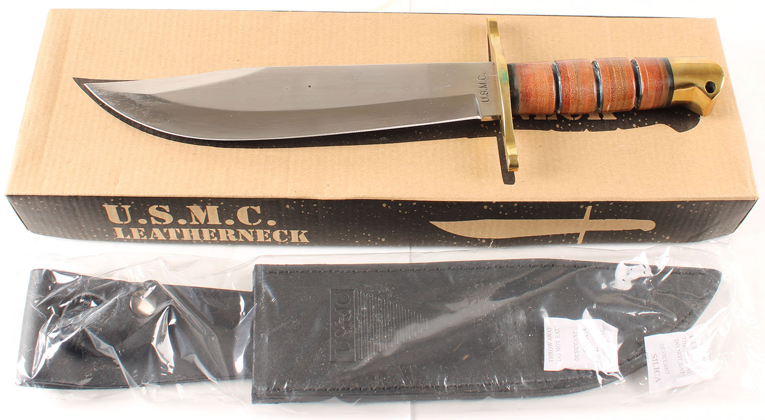 USMC Leatherneck knife, in original box with Sheath, 9'' blade. Grade: Excellent ++ - Value: 30 to 90