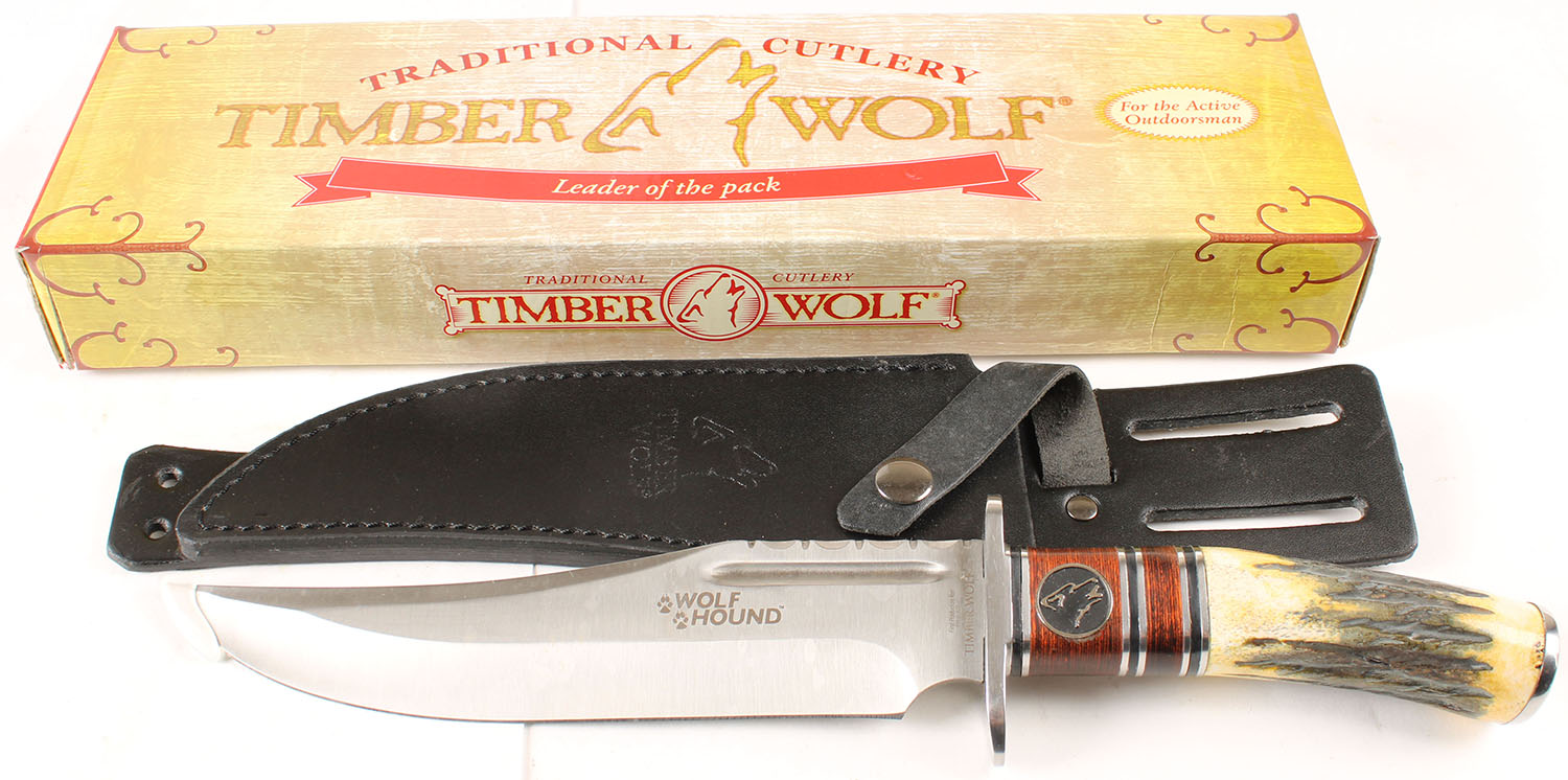 Timber Wolf large bowie knife, in original box with original stealth, has 7 1/2'' blade. Grade: Excellent ++ - Value: 20 to 80