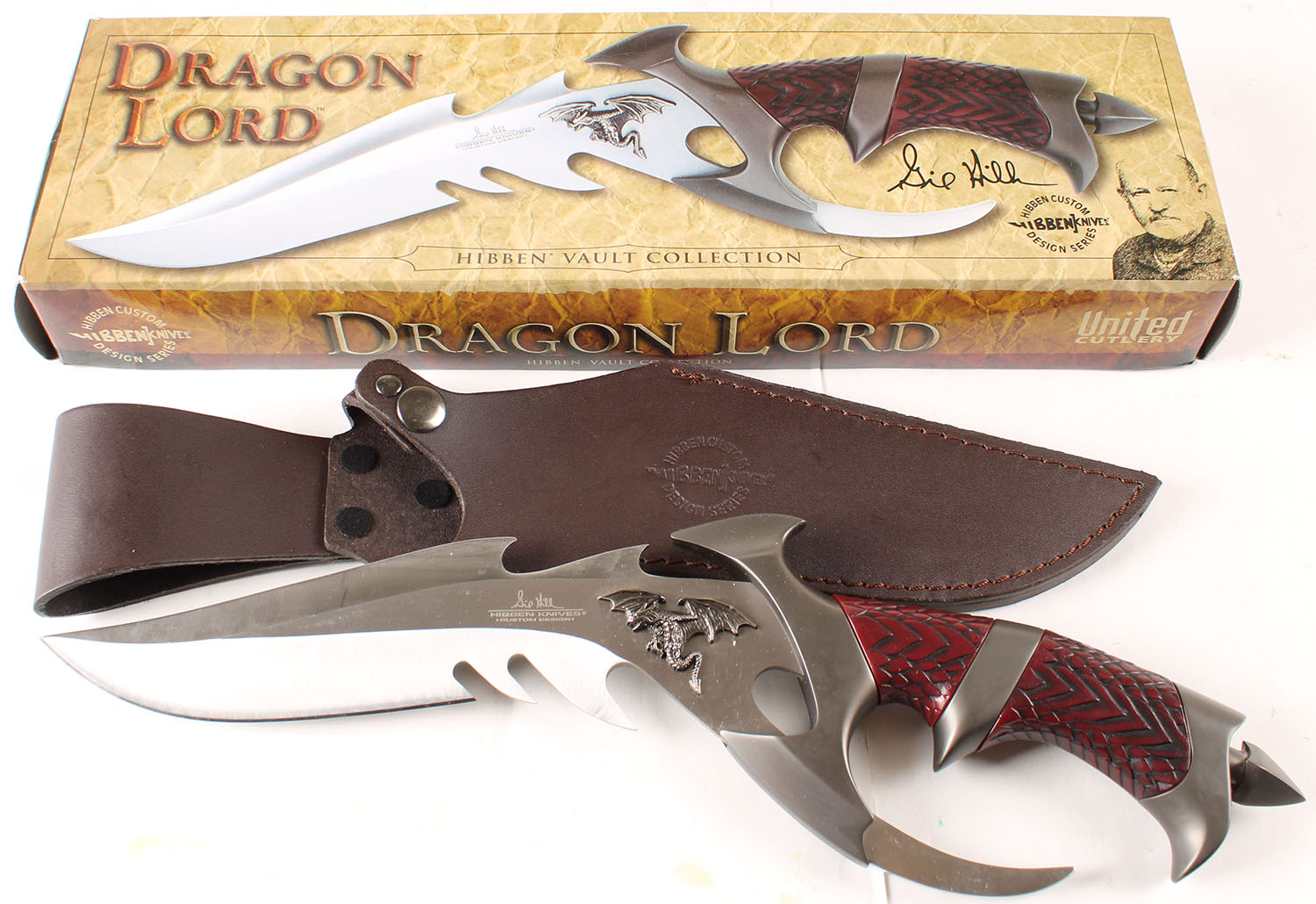 Hibben Dragon Lord knife, in original case with leather sheath, about a 7'' blade. Grade: Excellent ++ - Value: 20 to 60